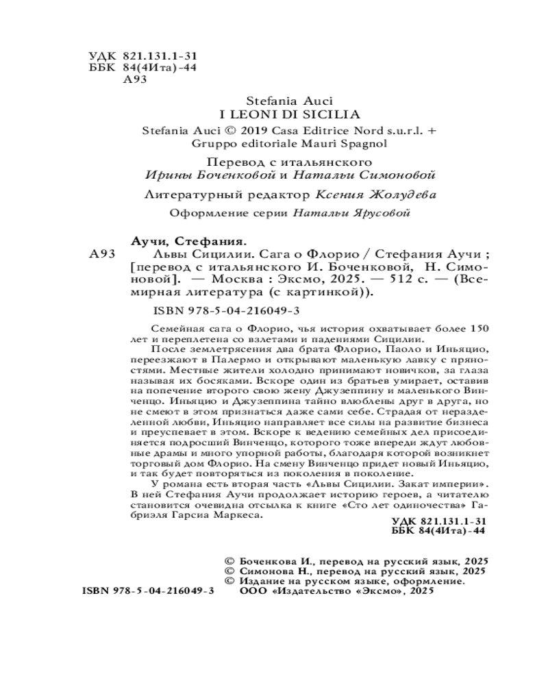 Серия: Всемирная литература (новое оформление) После землетрясения два брата Флорио, Паоло и Иньяцио, переезжают в Палермо и открывают маленькую лавку с пряностями. Местные жители холодно принимают новичков, за глаза называя их босяками. Вскоре один из братьев умирает, оставив на попечение второго свою жену Джузеппину и маленького Винченцо. Иньяцио и Джузеппина тайно влюблены друг в друга, но не смеют в этом признаться даже сами себе. Страдая от неразделенной любви, Иньяцио направляет все силы на развитие бизнеса и преуспевает в этом. Вскоре к ведению семейных дел присоединяется подросший Винченцо, которого тоже впереди ждут любовные драмы и много, много упорной работы, благодаря которой возникнет дом Флорио. На смену ему придет новый Иньяцио, и так будет повторяться из поколения в поколение. |