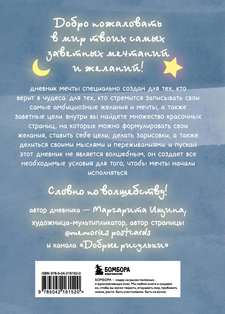 💳 Оплатить за товар можно при получении 🇰🇿 Есть бесплатная доставка по Казахстану от 1 дня 🎁 Копите бонусы с каждой покупки Серия: Мечтай! Волшебные блокноты для тех, кто верит в чудеса Дневник мечты специально создан для тех, кто верит в чудеса. Для тех, кто стремится записывать свои самые амбициозные желания и мечты, а также заветные цели. Внутри вы найдете множество красочных страниц, на которых можно формулировать свои желания, ставить себе цели, делать зарисовки, а также делиться своими мыслями и переживаниями. И пускай этот дневник не является волшебным, он создает все необходимые условия для того, чтобы мечты начали исполняться — словно по волшебству! Автор дневника — Маргарита Ищина, художница-мультипликатор, автор страницы @memories postcard и канала «Добрые рисульки». |