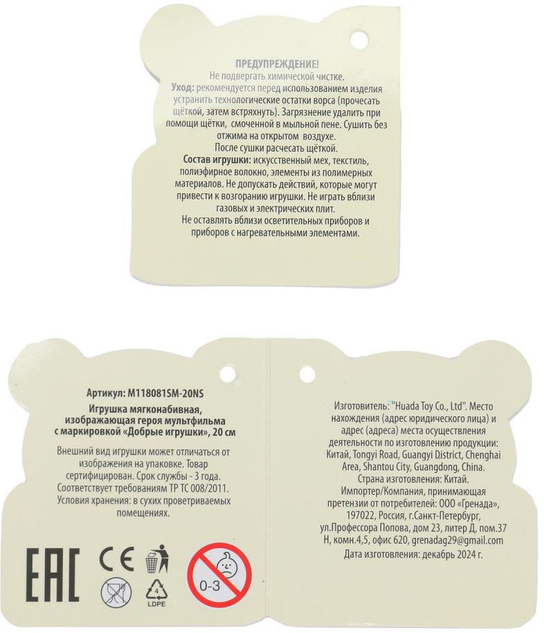 💳 Оплатить за товар можно при получении 🇰🇿 Есть бесплатная доставка по Казахстану от 1 дня 🎁 Копите бонусы с каждой покупки Мягкая игрушка «Герой мультфильма» ТМ «Добрые игрушки» — отличный подарок для маленьких поклонников популярного мультфильма. |
