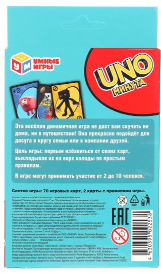 Карточная игра «УНО. По мотивам Minecraft» ТМ «Умные игры» — отличный вариант для увлекательного и познавательного времяпровождения вместе с ребёнком. Эта весёлая динамичная игра не даст вам заскучать ни дома, ни в путешествии! Она прекрасно подойдёт для досуга в кругу семьи или в компании друзей. Цель игры: первым избавиться от своих карт, выкладывая их на верх колоды по особым правилам, указанным в инструкции. Победит тот, кто первым выложит все свои карты. При желании игроки могут сыграть несколько раундов, подсчитывая очки за каждый раунд. В этом случае победителем станет игрок, первым набравший 500 очков. |