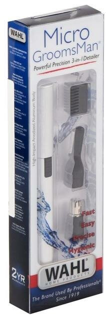 Беспроводной портативный триммер Wahl 5640-616 Micro Groomsman разработан для стрижки волос в носу или ушах, на шее, удаления волос в зоне бикини, подравнивания бровей или бакенбардов. Легко удаляет волосы в труднодоступных местах, безболезненно срезает волос и не царапает кожу. Триммер можно использовать дома, в командировках или путешествиях. Лезвия триммера и зубчики сделаны из нержавеющей стали. Режущие элементы из металлического сплава дольше сохраняют остроту заточки. Ножи можно промывать под струей проточной воды. Корпус триммера сделан из анодированного алюминия. Триммер работает от батарейки типоразмера ААА (входит в комплект).