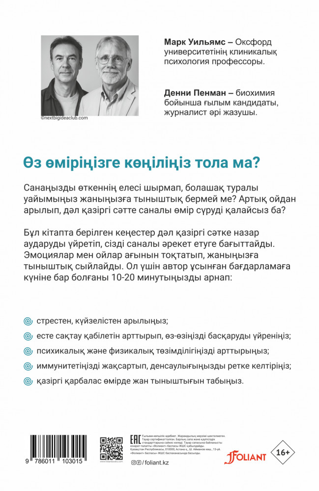 💳 Оплатить за товар можно при получении 🇰🇿 Есть бесплатная доставка по Казахстану от 1 дня 🎁 Копите бонусы с каждой покупки Серия: Әлемдік бестселлер Бұл кітап — қарбалас өмірде жан тыныштығын тапқысы келетін жандарға арналған практикалық нұсқаулық. Авторлар ұсынатын қарапайым және тиімді жаттығулар мен медитациялар адамның өмір сапасын жақсартуға, күйзеліс пен мазасыздықтан арылуға көмектесетін когнитивті терапияның ғылыми дәлелденген әдістеріне негізделген. Кітаптағы сегіз апталық медитация бағдарламасы саналы өмір сүру жолдарын ұсына отырып, қазіргі сәтке саналы түрде назар аударуды, жағымсыз эмоцияларды басқаруды үйретеді. |