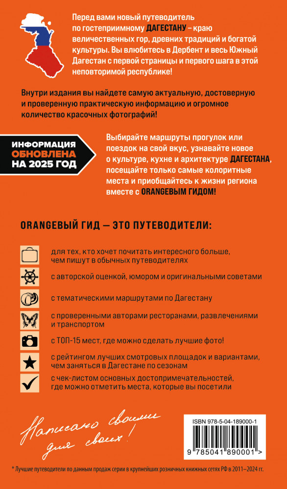 💳 Оплатить за товар можно при получении 🇰🇿 Есть бесплатная доставка по Казахстану от 1 дня 🎁 Копите бонусы с каждой покупки Серия: Оранжевый гид (обложка) Богатая культура, древние города и крепости, увлекательная история, неповторимая кавказская кухня и удивительной красоты природа — всё это Дагестан! Здесь раскинулись величественные Кавказские горы, плещется Каспийское море, глубокие ущелья хранят вековые тайны, а невероятные каньоны захватывают воображение! Отправляйтесь в незабываемое путешествие по региону вместе с «Оранжевым гидом»! В нем собрана актуальная и полезная информация о главных туристических направлениях Дагестана, маршруты на любой вкус, подсказки, что делать, если идет дождь, где искать лучшие смотровые площадки, множество полезных авторских советов. Вы узнаете, как добраться до легендарных аулов-призраков, исколесите весь Южный Дагестан, прогуляетесь по чарующему древнему Дербенту, отправитесь по живописному серпантину к Сулакскому каньону и даже в двухдневный поход! Готовые маршруты и удобные карты помогут вам легко ориентироваться и максимально насладиться поездкой. |