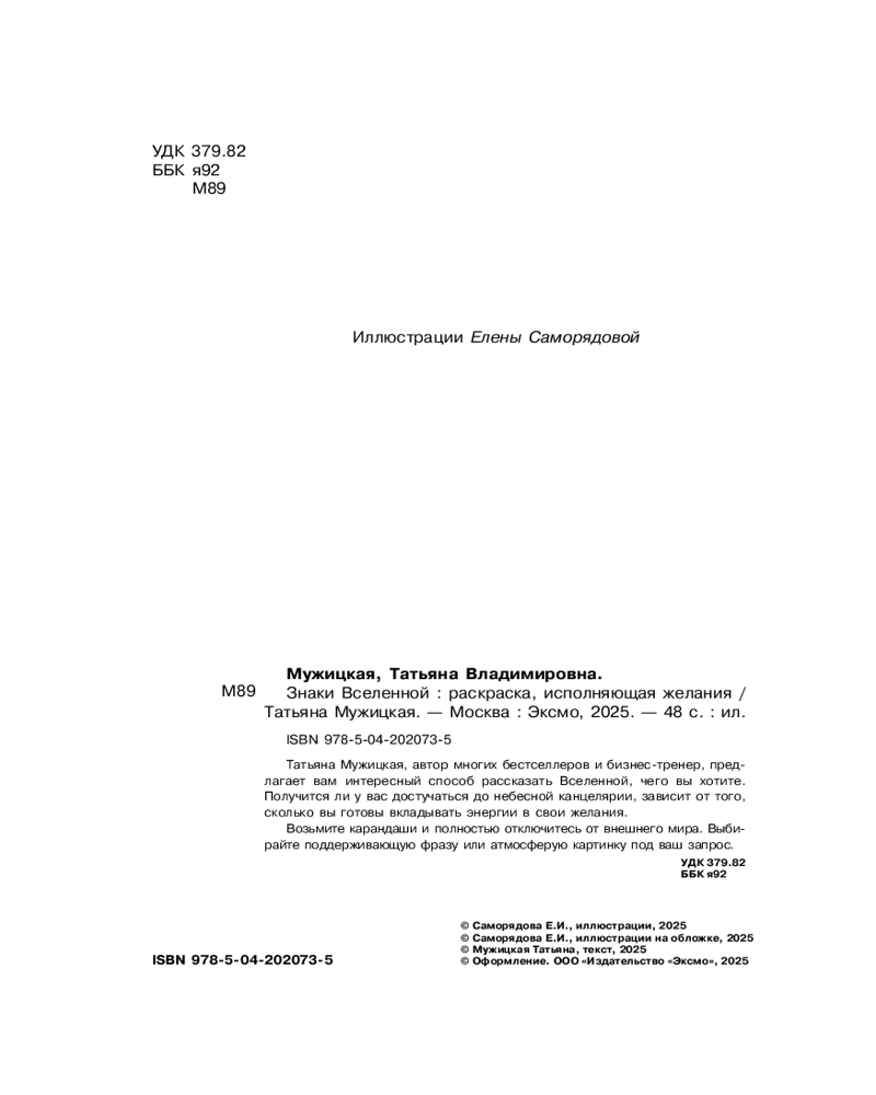 💳 Оплатить за товар можно при получении 🇰🇿 Есть бесплатная доставка по Казахстану от 1 дня 🎁 Копите бонусы с каждой покупки Серия: Искры вдохновения. Книги, которые исполняют желания Наши желания попадают в Небесную канцелярию разными путями. Иногда достаточно как следует помечтать, иногда — отправить письмо Деду Морозу, а порой — раскрасить картинку в тему. Именно это и предлагает вам сделать психолог, автор бестселлеров, радиоведущая и бард Татьяна Мужицкая в своей раскраске «Знаки Вселенной». |