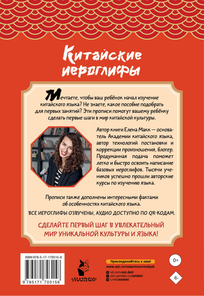 💳 Оплатить за товар можно при получении 🇰🇿 Есть бесплатная доставка по Казахстану от 1 дня 🎁 Копите бонусы с каждой покупки Серия: Китайский язык: раннее обучение Китайские прописи для начинающих — это отличный способ сделать первые шаги в мир уникальной культуры и увеличить нейронные связи мозга. Автор книги Елена Макк — создатель Академии китайского языка — поможет освоить базовые принципы написания иероглифов, отработать каждый элемент и довести навык до автоматизма. Прописи также дополнены фактами о китайском языке. Все иероглифы озвучены, аудио доступно по QR-кодам. Для начального образования. |