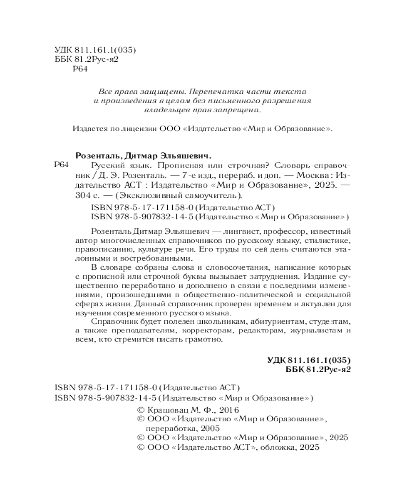 💳 Оплатить за товар можно при получении 🇰🇿 Есть бесплатная доставка по Казахстану от 1 дня 🎁 Копите бонусы с каждой покупки Серия: Эксклюзивный самоучитель Розенталь Дитмар Эльяшевич — лингвист, профессор, известный автор многочисленных справочников по русскому языку, стилистике, правописанию, культуре речи. Его труды по сей день считаются эталонными и востребованными. В словаре собраны слова и словосочетания, написание которых с прописной или строчной буквы вызывает затруднения. Издание существенно переработано и дополнено в связи с последними изменениями, произошедшими в общественно-политической и социальной сферах жизни. Данный справочник проверен временем и актуален для изучения современного русского языка. |