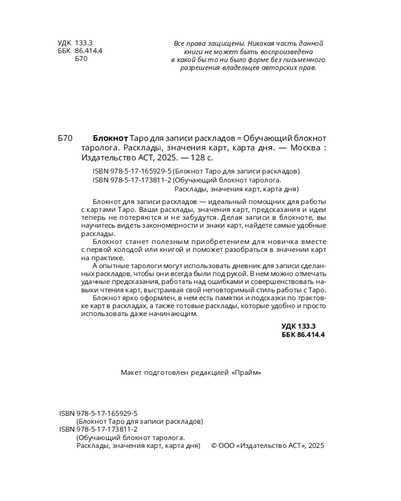 💳 Оплатить за товар можно при получении 🇰🇿 Есть бесплатная доставка по Казахстану от 1 дня 🎁 Копите бонусы с каждой покупки Серия: Дневник магии Блокнот для раскладов — это идеальный помощник для работы с картами Таро, который станет полезным дополнением к вашей первой колоде и книге. Делая записи в блокноте, вы научитесь видеть закономерности и знаки карт. Они помогут найти соответствия предсказанным событиям в жизни, не упустить нюансы, которые со временем неизбежно забываются, понять, что каждая карта означает именно для вас. Работать с блокнотом довольно просто и полезно. Сделайте расклад — запишите дату, выпавшие карты и как вы их прочитали в тот момент. Затем, спустя время, вы сможете вернуться к записи и понять, насколько точным было предсказание. Блокнот станет полезным приобретением для новичка вместе с первой колодой или книгой и поможет быстро набрать опыт в практике толкования. Для опытных тарологов дневник станет отличным помощником, чтобы не забывать трактовки. |