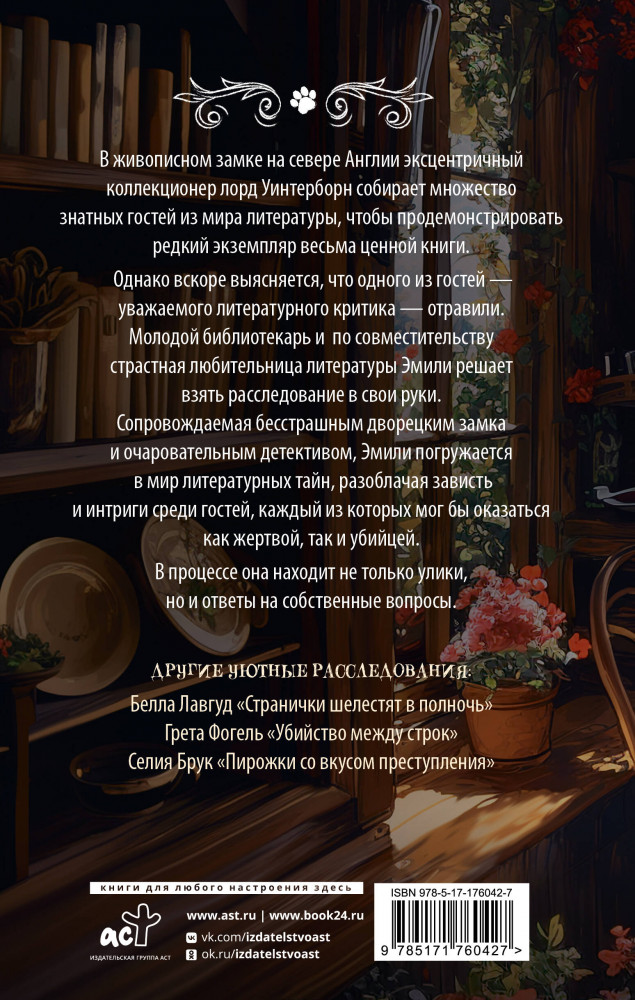 Святые печенюшкилёгкий стиль оформление хороший перевод простой сюжет качество бумаги В данный момент этот товар отсутствует в продаже. Возможно, у нас найдется аналогичный или похожий товар здесь. Серия: Уютные расследования В живописном замке на севере Англии эксцентричный коллекционер лорд Уинтерборн собирает множество знатных гостей из мира литературы, чтобы продемонстрировать редкий экземпляр весьма ценной книги. Однако вскоре выясняется, что одного из гостей — уважаемого литературного критика — отравили при помощи той самой книги. Молодая библиотекарь и страстная любительница литературы Эмили решает взять расследование в свои руки. Сопровождаемая бесстрашным дворецким замка и очаровательным детективом, Эмили погружается в мир литературных тайн, разоблачая зависть и интриги среди гостей, каждый из которых мог бы оказаться как жертвой, так и убийцей. В процессе она находит не только улики, но и ответы на собственные вопросы. |