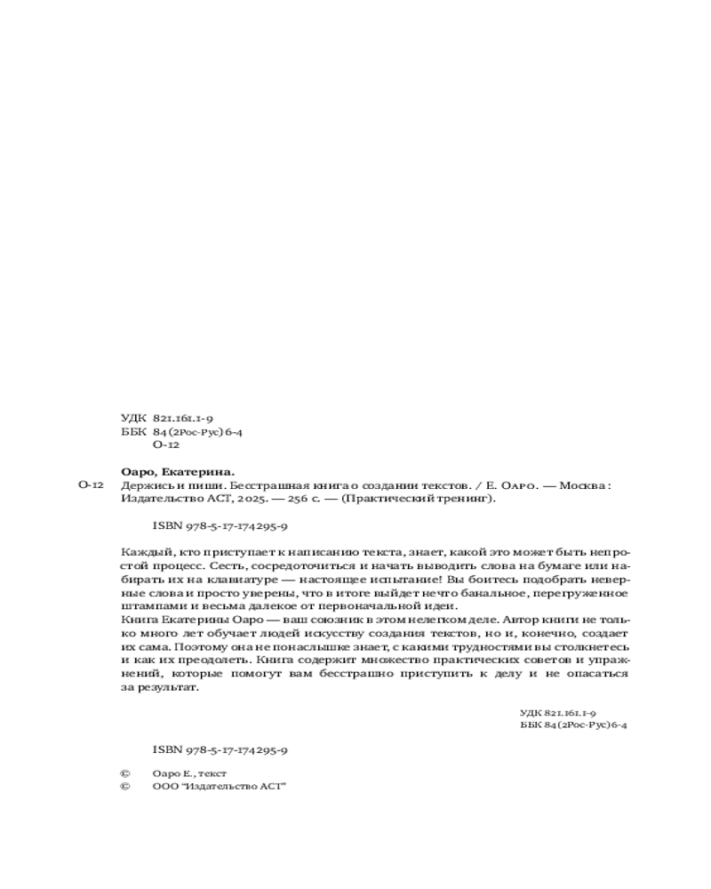 💳 Оплатить за товар можно при получении 🇰🇿 Есть бесплатная доставка по Казахстану от 1 дня 🎁 Копите бонусы с каждой покупки Серия: Практический тренинг Каждый, кто приступает к написанию текста, знает, какой это может быть непростой процесс. Сесть, сосредоточиться и начать выводить слова на бумаге или набирать их на клавиатуре — настоящее испытание! Вы боитесь подобрать неверные слова и просто уверены, что в итоге выйдет нечто банальное, перегруженное штампами и весьма далекое от первоначальной идеи. |
