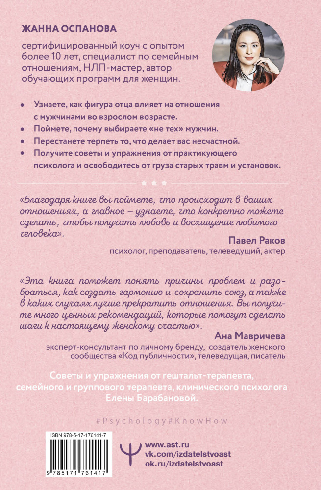 💳 Оплатить за товар можно при получении 🇰🇿 Есть бесплатная доставка по Казахстану от 1 дня 🎁 Копите бонусы с каждой покупки Серия: Psychology#KnowHow Жанна Оспанова — сертифицированный коуч с опытом более 10 лет, специалист по семейным отношениям, НЛП-мастер, кандидат экономических наук, автор обучающих программ для женщин. Почему вы снова выбираете «не того» мужчину? Почему терпите то, что делает несчастной? Что мешает построить отношения, в которых вы будете счастливы? Почему не хватает сил и смелости разорвать уже изжившую себя связь? Почему все мужчины вокруг «одинаковые»? Если вы, как и Жанна Оспанова, задавались этими вопросами, то эта книга — для вас. |