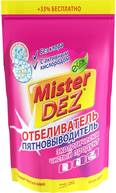 Пятновыводитель Mister Dez отлично подходит для всех типов тканей, включая деликатные, и может использоваться как в стирке, так и для предварительной обработки пятен. Всего несколько граммов средства в сочетании с горячей водой — и вы получаете мощный раствор для выведения самых стойких загрязнений. Можете быть уверены, что данный кислородный очиститель поможет справиться даже с самыми сложными пятнами.
