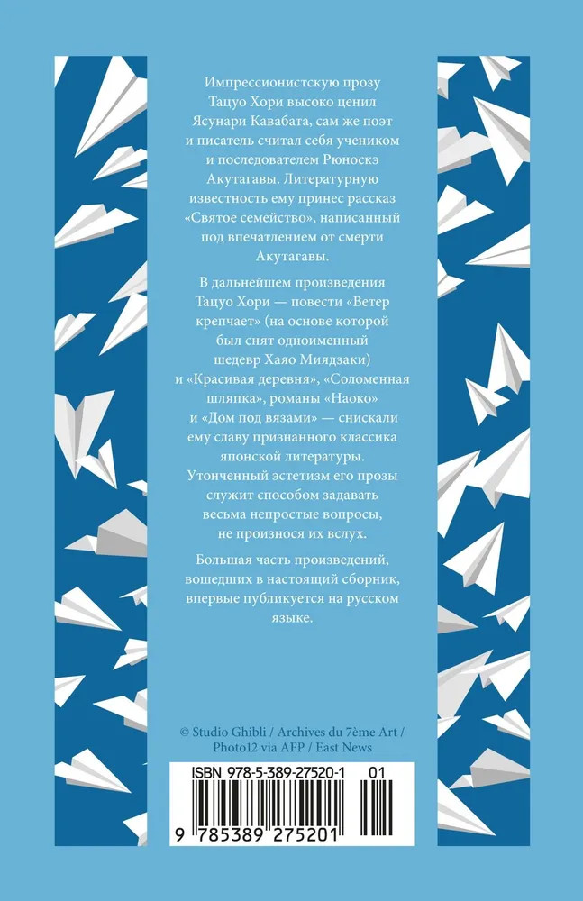 Серия: Изящная классика Востока Сборник произведений классика японской литературы Тацуо Хори, в котором представлены наиболее значимые — повести «Ветер крепчает» (на основе которой был снят одноименный шедевр Хаяо Миядзаки), «Соломенная шляпка», роман-дилогия «Наоко» и «Дом под вязами», а также рассказы. Большинство произведений впервые выходят на русском языке. Издание сопровождается статьей переводчика, исследователя творчества Тацуо Хори, Екатерины Юдиной. Импрессионистскую прозу Тацуо Хори высоко оценивал Ясунари Кавабата. Сам же Хори считал себя учеником и последователем Рюноскэ Акутагавы — с их самой первой встречи, которая состоялась в 1923 году, когда Хори было 19 лет. В 1930 году Хори впервые получил признание благодаря рассказу «Святое семейство», написанному под впечатлением от смерти Акутагавы.