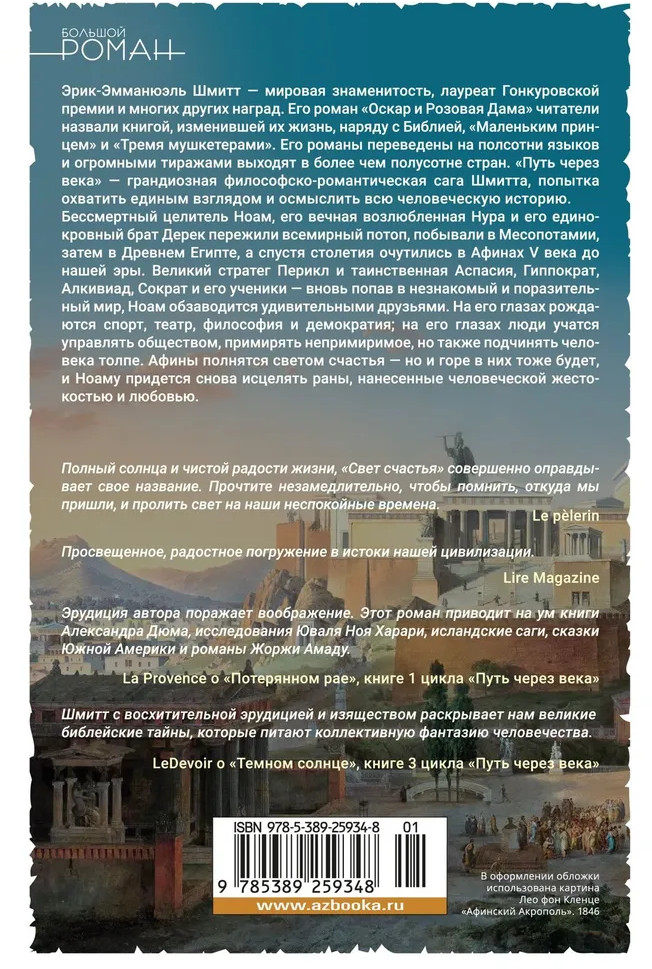 💳 Оплатить за товар можно при получении 🇰🇿 Есть бесплатная доставка по Казахстану от 1 дня 🎁 Копите бонусы с каждой покупки Серия: Большой роман Пророчество Дельфийского оракула и новая любовь приводят одаренного бессмертием Ноама в Древнюю Грецию. Великий стратег Перикл и таинственная Аспасия, Гиппократ, Алкивиад, Сократ и его ученики — вновь попав в незнакомый и поразительный мир, Ноам обзаводится удивительными друзьями. На его глазах рождаются спорт, театр, философия и демократия; на его глазах люди учатся управлять обществом, примирять непримиримое, но также подчинять человека толпе. Афины полнятся светом счастья — но и горе в них тоже будет, и Ноаму придется снова исцелять раны, нанесенные человеческой жестокостью и любовью. Впервые на русском! |