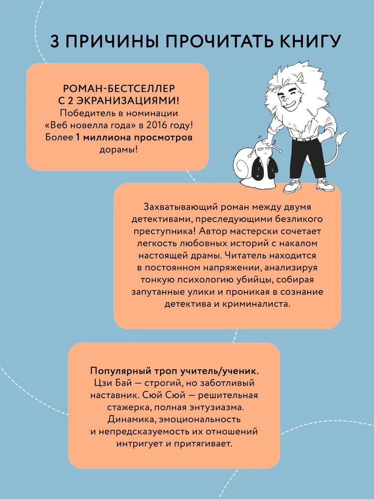 💳 Оплатить за товар можно при получении 🇰🇿 Есть бесплатная доставка по Казахстану 🎁 Копите бонусы с каждой покупки Серия: Сердце Азии Сюй Сюй — талантливая стажерка криминальной полиции. Цзи Бай — легендарный детектив, не знающий жалости к преступникам. Вместе они раскрывают одно дело за другим, постепенно разбираясь не только в чужих тайнах, но и в собственных чувствах. Несмотря на суровый характер, Цзи Бай понимает, что их связывает нечто большее, чем работа. Но бесстрашная перед лицом смертельной опасности Сюй Сюй в любви медлительна, как улитка. Сможет ли грозный детектив открыть сердце и завоевать расположение своей ученицы? |