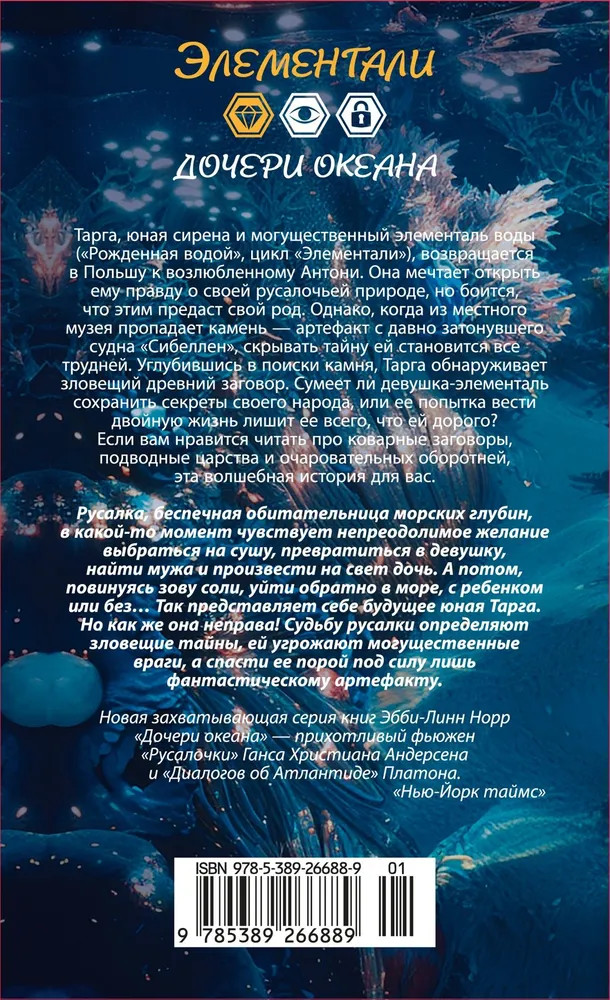 Серия: Элементали. Дочери океана Юной канадке Тарге полагалось бы учиться в выпускном классе в родном Солтфорде, но она — сирена, элементаль воды, наследница владельца польской «Судоходной компании Новаков» и владелица останков затонувшего судна «Сибеллен». И вот девушка в Гданьске, с возлюбленным Антони и мамой-русалкой Майрой, наслаждается богатством и длительными купаниями в Балтике. Но кое-что сильно омрачает ей жизнь. Майра больше не может оставаться на суше, ее влечет к себе океан, а объяснить Антони, куда подевалась мать Тарга не может: русалочья природа — ее великая тайна. Дело принимает совсем скверный оборот, когда кто-то крадет подвеску с прозрачно-бирюзовым кристаллом — один из артефактов с «Сибеллен». Пытаясь разгадать мотивы вора и изловить его, Тарга попадает в невероятно опасную переделку на другом конце света, а ее возлюбленный едва не лишается жизни... |
