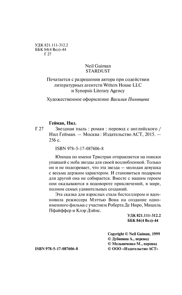 Прекрасная сказка в замечательном оформлении. Достаточно читабельный шрифт для тех, у кого слабое зрение. Удобный формат и твердый переплет радует. Много лет назад я посмотрела экранизацию сказки и сейчас, читая оригинальную историю и основу сюжета фильма, понимаю что в какой-то степени книга хороша, но и фильм ей не уступает. Это первая книга из-под пера Нила Геймана, которую я прочитала. И теперь, думаю, что не последняя. Советую почитать всем родителям!