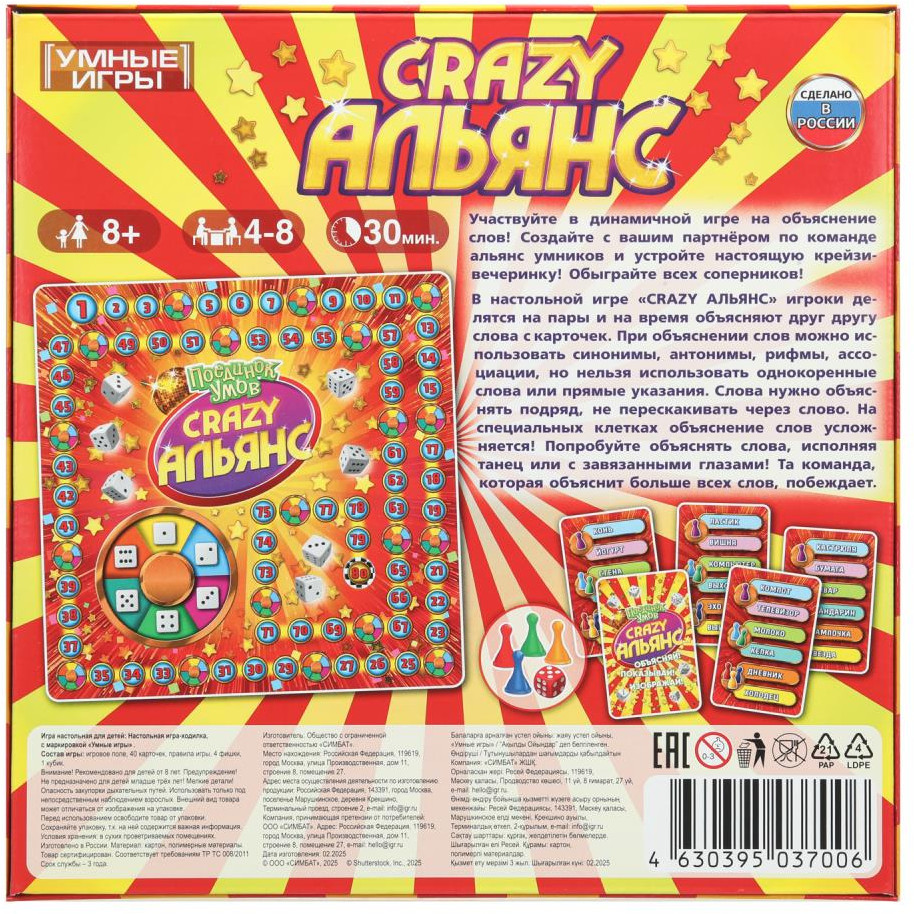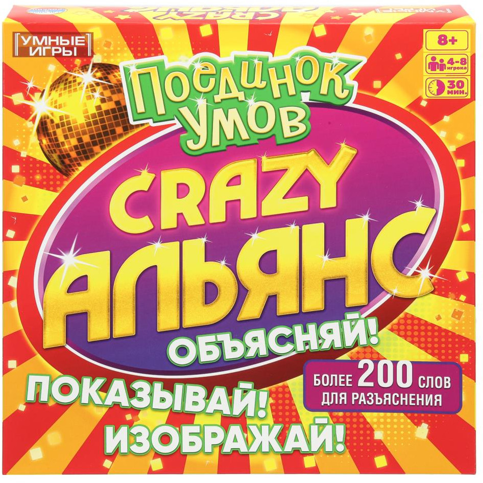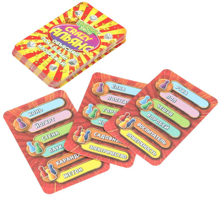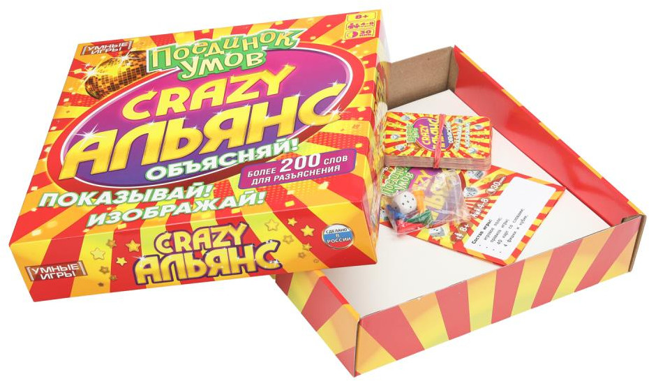 Умные игры Игра настольная «Crazy Альянс: поединок умов»В данный момент этот товар отсутствует в продаже. Возможно, у нас найдется аналогичный или похожий товар здесь. Создайте со своей командой альянс эрудитов и обыграйте всех соперников! В настольной игре «Crazy Альянс: поединок умов» игроки делятся на пары и на время объясняют друг другу слова с карточек, используя синонимы, антонимы, рифмы, ассоциации — всё, кроме однокоренных слов. Слова предстоит объяснять подряд: не нужно перескакивать через слово. Если вы попали на специальную клетку поля, задача усложняется: попробуйте объяснить слова, например, исполняя задорный танец. Побеждает та команда, которая отгадает как можно больше слов. |