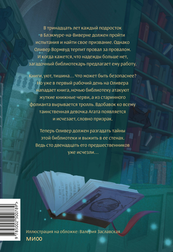 💳 Оплатить за товар можно при получении 🇰🇿 Есть бесплатная доставка по Казахстану от 1 дня 🎁 Копите бонусы с каждой покупки Серия: МИФ. Книжные истории Названа лучшей детской книгой года по версии QBD 2024. Права на книгу проданы в 6 стран! Оливер Вормвуд, как и все тринадцатилетние подростки в Блэкмур-на-Виверне должен найти свое призвание, но проваливает одно испытание за другим и остается без профессии. Когда надежд уже не осталось, он встречает загадочного библиотекаря, который предлагает стать его помощником. Казалось бы, что может быть безопаснее, чем работать в библиотеке... Но в первый же день на Оливера нападает книга, ночью библиотеку атакуют книжные черви, из старинного тома вырывается жуткий тролль, а через некоторое время происходит несколько неожиданных смертей... Вдобавок ко всему странная девочка Агата появляется неизвестно откуда и также пропадает. Теперь Оливер должен разгадать тайны этой библиотеки и выжить в её стенах. Ведь 112 его предшественников уже исчезли... Искрометное фантастическое приключение, полное опасностей, тайн, волшебных книг и неожиданных поворотов. |
