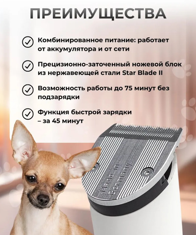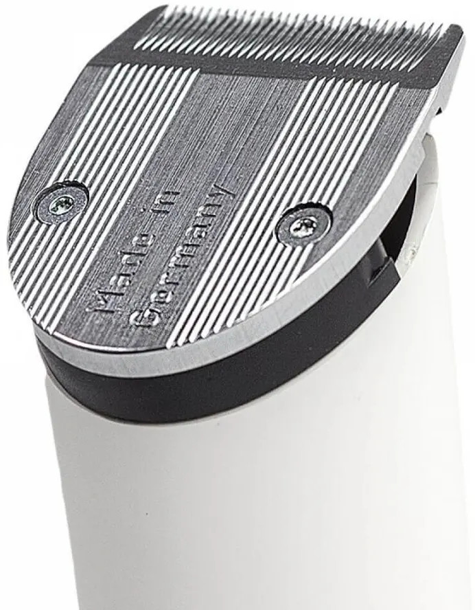 • прецизионно-заточенный ножевой блок из нержавеющей стали, Made in Germany. Чистая стрижка с высотой среза 0,4 мм. Смена ножевого блока в одно нажатие, удобство чистки. Закрытая задняя часть ножевого блока снижает риск попадания шерсти внутрь и упрощает очистку лезвий. Ножевой блок снабжен бороздами — система Cool Touch — для лучшего скольжения и уменьшения нагрева;