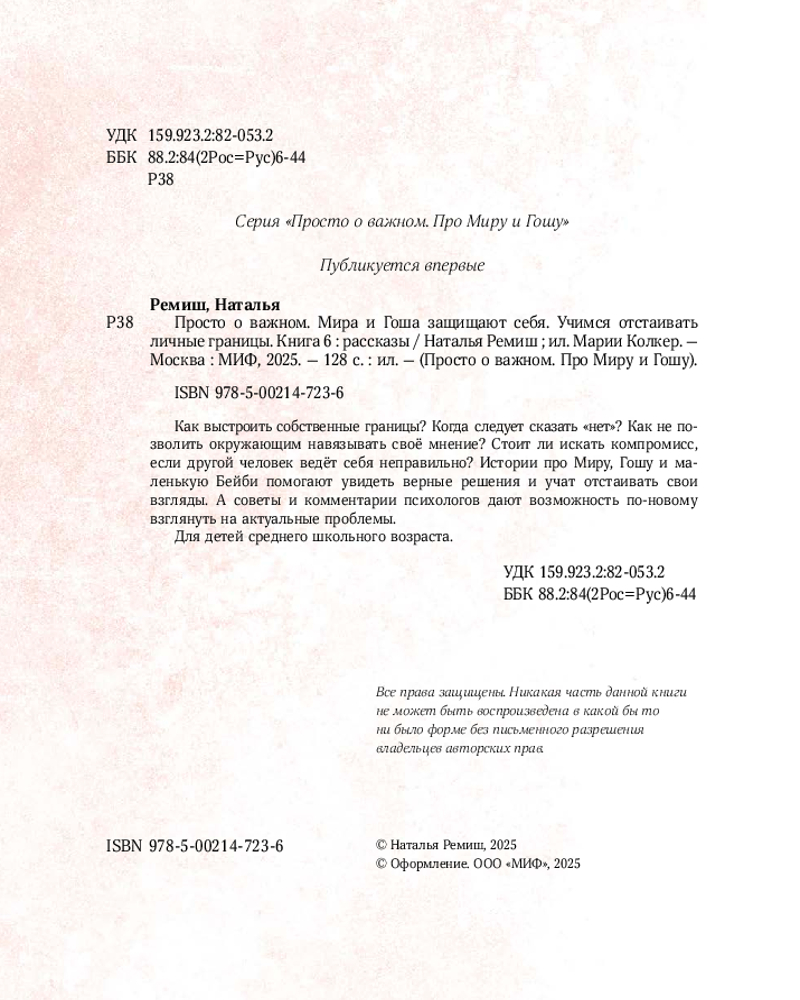 💳 Оплатить за товар можно при получении 🇰🇿 Есть бесплатная доставка по Казахстану от 1 дня 🎁 Копите бонусы с каждой покупки Серия: Просто о важном. Про Миру и Гошу Как выстроить собственные границы? Когда следует сказать «нет»? Как не позволить окружающим навязывать свое мнение? Стоит ли искать компромисс, если другой человек ведет себя неправильно? Новая книга Натальи Ремиш отвечает на эти и многие другие вопросы. Ее герои — Мира, Гоша и маленькая Бейби исследуют свои и чужие границы и учатся разрешать конфликты. А советы и комментарии психологов позволяют по-новому взглянуть на актуальные проблемы. |