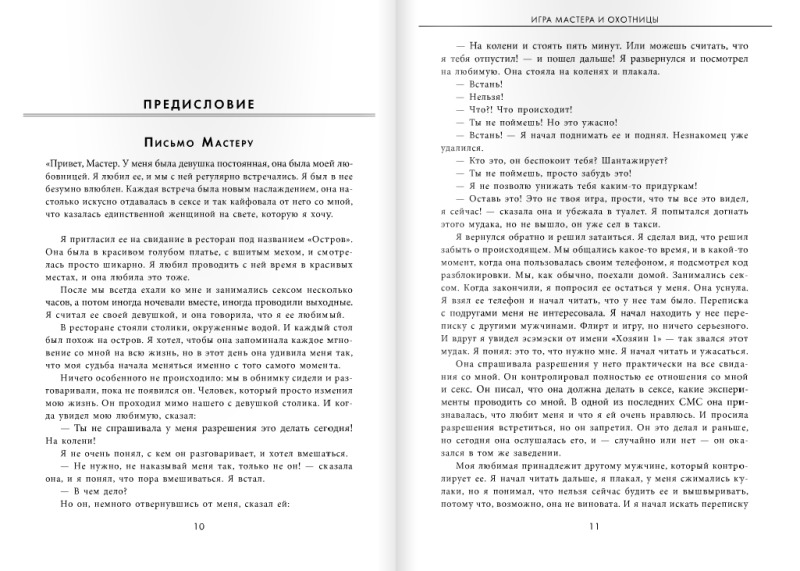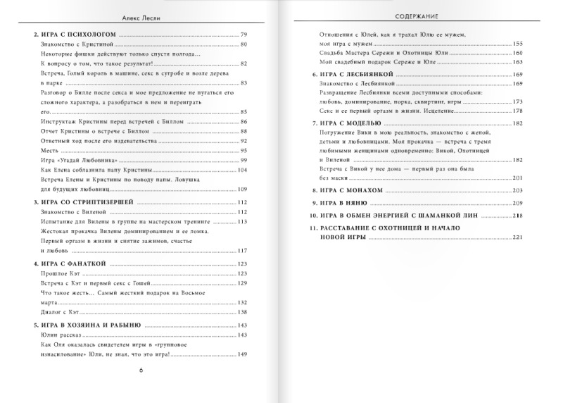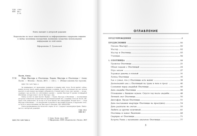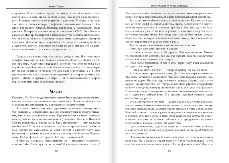 «Игра Мастера и Охотницы» – самое неоднозначное «лесливское» чтиво. Насколько я рекомендую прочитать его предыдущий пикап-труд «Охота на самца», настолько не рекомендую эту книгу – в потоке чужого дерьма вы рискуете захлебнуться и навсегда получить отвращение к искусству красивого соблазнения. Чтобы моя рецензия не выглядела занудством и моразилаторством, сразу оговорюсь: я сама из тех женщин, кто умеет соблазнять, имею опыт доминирования и подчинения в Теме и организовываю тренинги по сексуальным практикам. Кроме того, я в браке уже много лет, и с мужем мы прошли вместе все возможные кризисы и эксперименты, какие только выпадают на долю двух темпераментных и любящих людей, готовых друг другу многое позволить и многое простить. Итак, коротко содержание предыдущей книги – «Охота на самца». Вернее, для кого эта книга? Ее обязательно следует читать всем тридцати-сорокалетним девушкам, которые, есть риск, могут все еще пребывать в иллюзиях касательно отношений и мужской психологии. И которые уверены, что знакомиться с клевыми мужиками – это значит сидеть в полупустом кафе с загадочными лицом и тусоваться всенепременно в окружении подруг, высокомерно ведущих себя с мужчинами и отпугивающих даже стоящие варианты. Очень полезно узнать, что все стандартные тактики «знакомства с приличными мужиками» — не работают (и его следствие – те самые «котики» как главные и единственные гости на сорокалетие). Увы, кроме как рекомендации не пускать мужчину к своим бесценнейшим трусам до свадьбы, послевоенное и последующие поколения советских женщин больше ничего не дали своим дочерям в вопросах женской натуры и женского счастья. Так что читайте «Охоту на самца» — вам гарантированы не только инсайты, но и несколько часов очень забавного чтива. И обязательно сделайте домашку. Если научитесь легко подходить на улице к понравившемуся объекту, брать его за руку и уводить с собой, — любой будет вашим, хоть на час, хоть на всю жизнь. Охотиться самой, а не быть предметом чужой охоты — что может быть слаще. «Охота на самца» учит не только грамотно мужика выбирать и «не быть лохушкой», но и влюблять, используя метод «дать все – забрать все» или создавая конкуренцию (большинство женщин считает, что они притягательные своей показушной «верностью», а оказывается, это никому не нужно, и страстно любима та, которая и не скрывает конкуренцию за себя). Остальное прочтете сами. А теперь к нашим баранам – «Игре Мастера и Охотницы». Когда я читала эту книгу, у меня было ощущение, что у Лесли а) окончательно съехала крыша б) он уныло и банально женился и теперь представляет интересную жизнь исключительно в своих фантазиях. В «Играх» типа «крутых охотниц» имеют как хотят и где хотят, норма встречи — изнасилование (а это частый риск тех девушек, которые подаются в Тему и нарываются на сумасшедшего садиста вместо вменяемого Господина, поверьте мне, я много историй выслушала – все не так радужно, как это рисуется в романах про БДСМ). И сам Лесли нарушает все правила Темы – стоп-слова для него нет, ответственности за своих сабмиссивов он толком и не несет (читайте – значит никакой он не доминант), а туда же — себя возомнил вершителем чужих судеб и избавителем от травм. Лесли утверждает, что из серых мышей, никому не интересных и проживающих мещанскую жизнь, он выискива