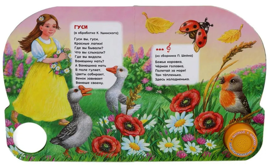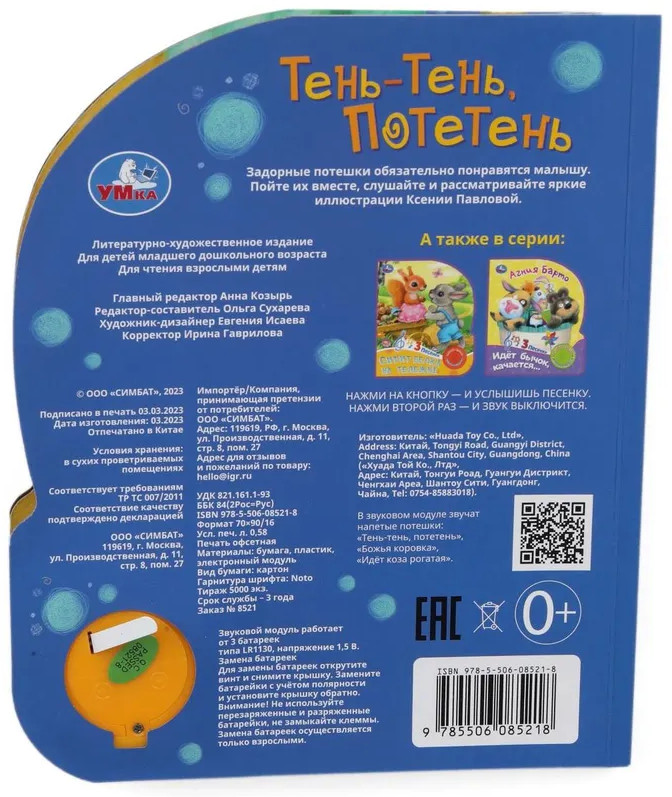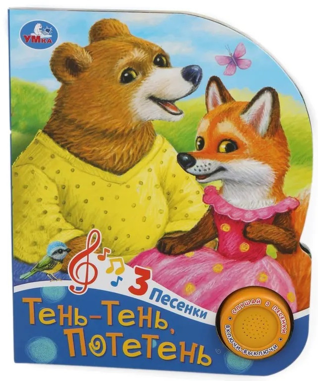Музыкальная книга «Тень-тень потетень» ТМ «УМка» станет прекрасным подарком для малыша. Ребёнок с удовольствием будет листать плотные страницы, рассматривать красочные картинки и, конечно, нажимать на кнопку и слушать задорные песенки-потешки. Малыш легко освоит включение звука: по нажатию на кнопку песенка включится, при втором нажатии выключится, при третьем — заиграет следующая композиция. Благодаря компактному размеру книгу удобно взять с собой в дорогу. Чтение музыкальной книги ТМ «УМка» и игра с ней развивают: слуховое восприятие, навык чтения, фантазию, образное мышление и память.