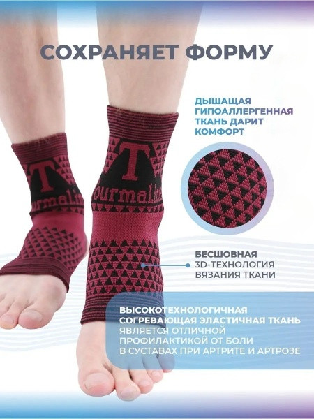 Изделие изготовлено из эластичного био-магнитного турмалинового волокна. Плотно обхватывает голеностопный сустав, очень удобны в ежедневном применении.