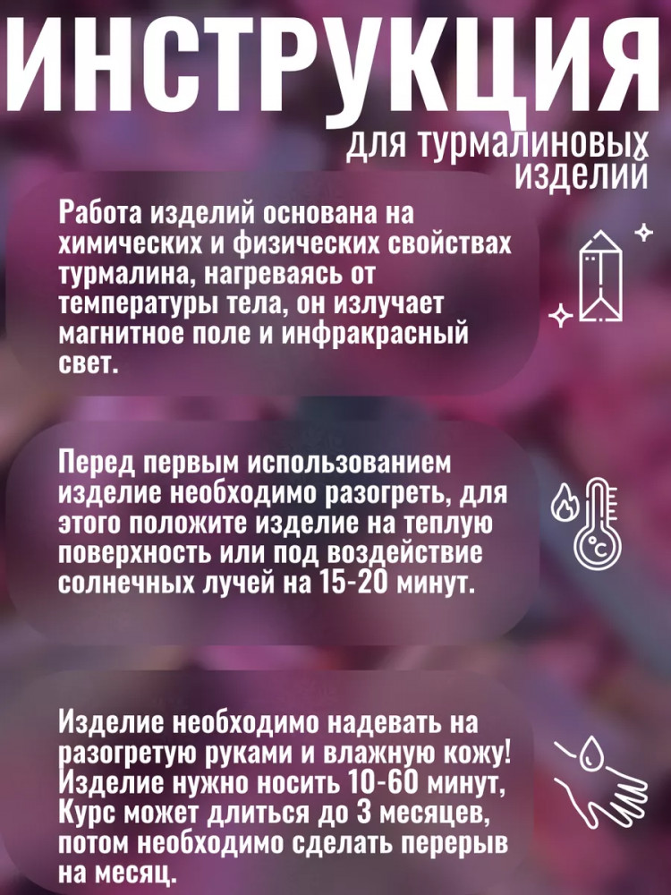 Уход: магнитные голеностопы с турмалином не требуют специального ухода. Стирка не более 5 минут при температуре воды до 30 градусов. Запрещено замачивать, использовать мыло, отбеливатели, стиральный порошок.