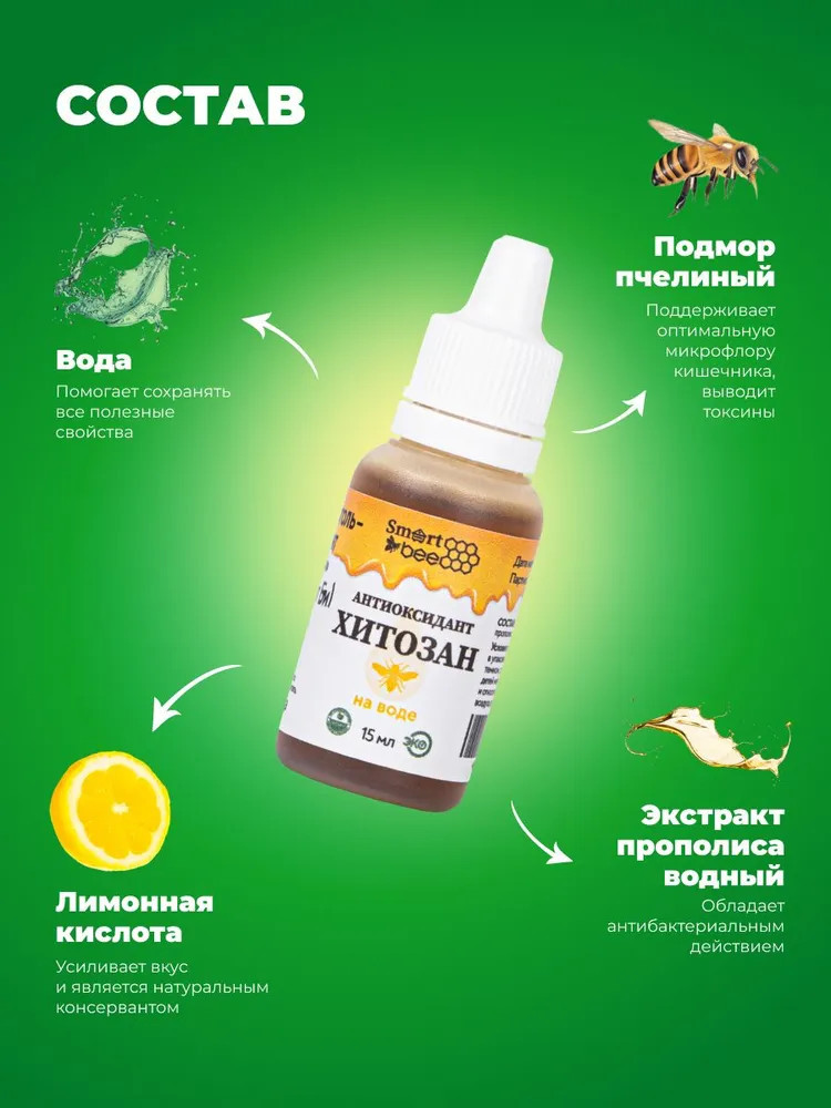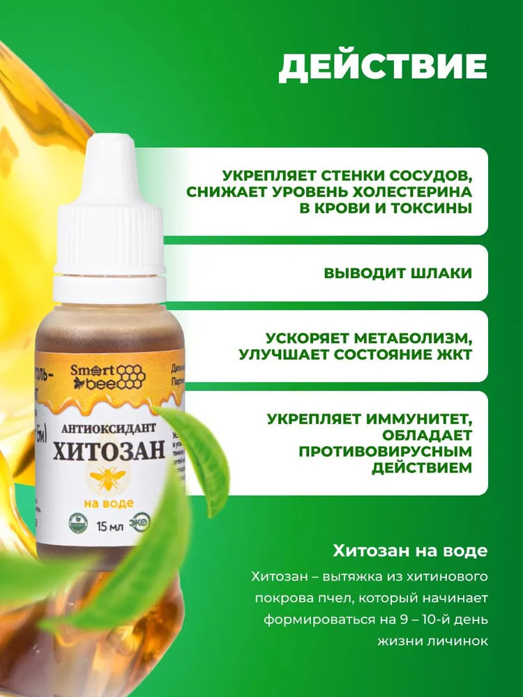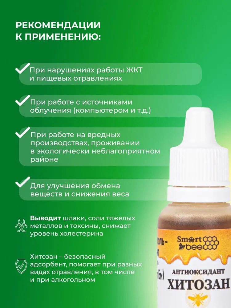 Антиоксидант Хитозан Smart Bee используется для повышения естественных сил организма, коррекции веса, омоложения кожи, снижения уровня холестерина и дезинтоксикации организма (в экологически неблагоприятных районах проживания, при работе на вредных производствах, при работе с компьютерами и другими источниками облучения), а также для улучшения кровообращения и профилактики новообразований. Оказывает поддержку при выведении шлаков и токсинов. Хитозан — безопасный адсорбент.