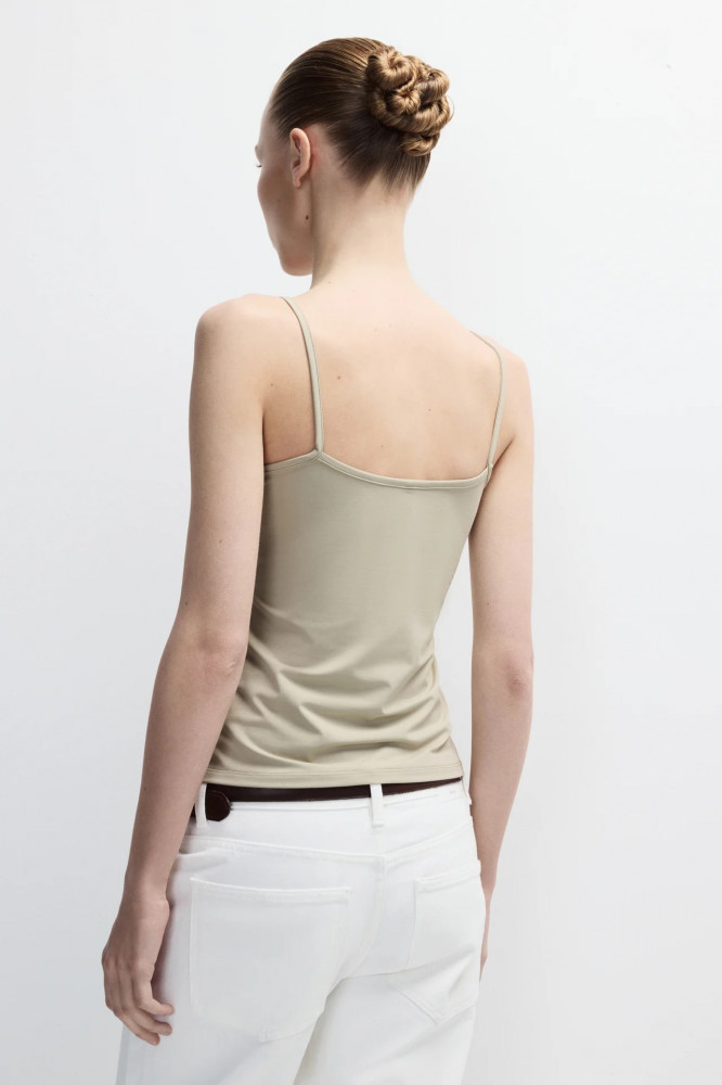 Женская майка облегающего кроя из эластичной, гладкой и приятной к телу ткани. Глубокий вырез-каре, низкая линия спинки. Тонкие нерегулируемые бретели. Прямой нижний край без разрезов и декоративных элементов.
