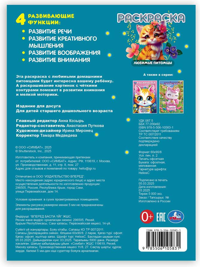 💳 Оплатить за товар можно при получении 🇰🇿 Есть бесплатная доставка по Казахстану от 1 дня 🎁 Копите бонусы с каждой покупки Раскраска «Любимые питомцы» ТМ «УМка» обязательно понравится юным художникам. Эта занимательная раскраска с очаровательными питомцами не только скрасит досуг ребёнка, но и поможет потренировать руку к письму. Внутри детей ожидают интересные картинки с чётким контуром и сюжетные тексты к ним. Благодаря удобному формату раскраску можно взять с собой в дорогу. Игровые занятия с раскраской ТМ «УМка» способствуют развитию: мелкой моторики, сенсорного развития, творческого мышления, внимания и речи. |