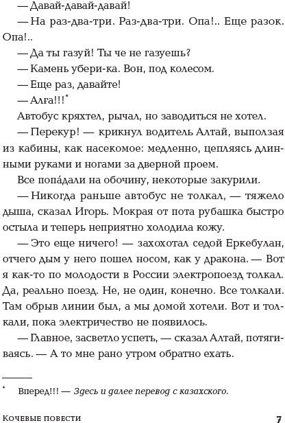 «Праздник начался рано. Уже около двух часов пополудни гости собрались в просторной комнате, уселись за дастархан, накрытый прямо на полу. Отец невесты Болатбек, сложив ладони лодочкой, прочел перед едой молитву, провел ладонями по лицу, и все повторили вслед за ним.»