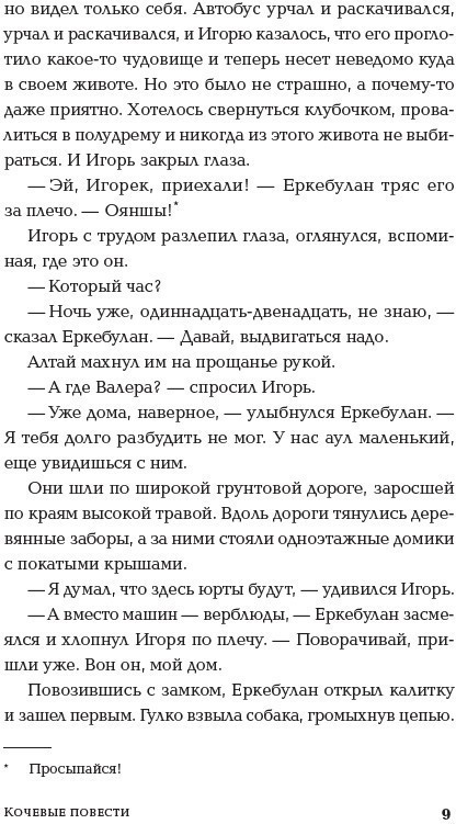 «Махмудик взял за спинку стул, стоящий в углу, и подтащил к центру комнаты. Сел. Чуть тронул струны кобыза. У Игоря по позвоночнику побежали мурашки. Махмудик постучал пальцами по корпусу. Тыгыдык-тыгыдык-тыгыдык. Будто лошадь скачет. Тыгыдык-тыгыдык-тыгыдык. Смычок скользил, то скатываясь в хрип басов, то поднимаясь к агонизирующему визгу верхних нот. Затаив дыхание, Игорь слушал эту музыку, и чем дольше она длилась, тем явственней в ней начали возникать посторонние звуки. Вот защелкали клювами, защебетали птицы. Вот затопали, звонко захохотали бегущие друг за другом дети. Вот зашелестели колосья от налетевшего порыва ветра. Вот плеснулась рыба, зашуршал дождь и расколол небо раскатистый гром. Вот сухо, тихо, причмокивая беззубыми ртами, заплакали старики. В каждом звуке была своя история, а вместе они складывались в целый мир, как будто эта мелодия и была миром.»