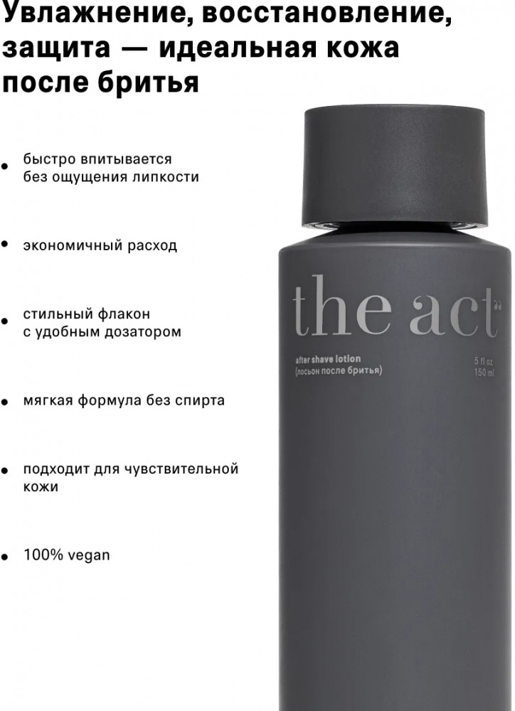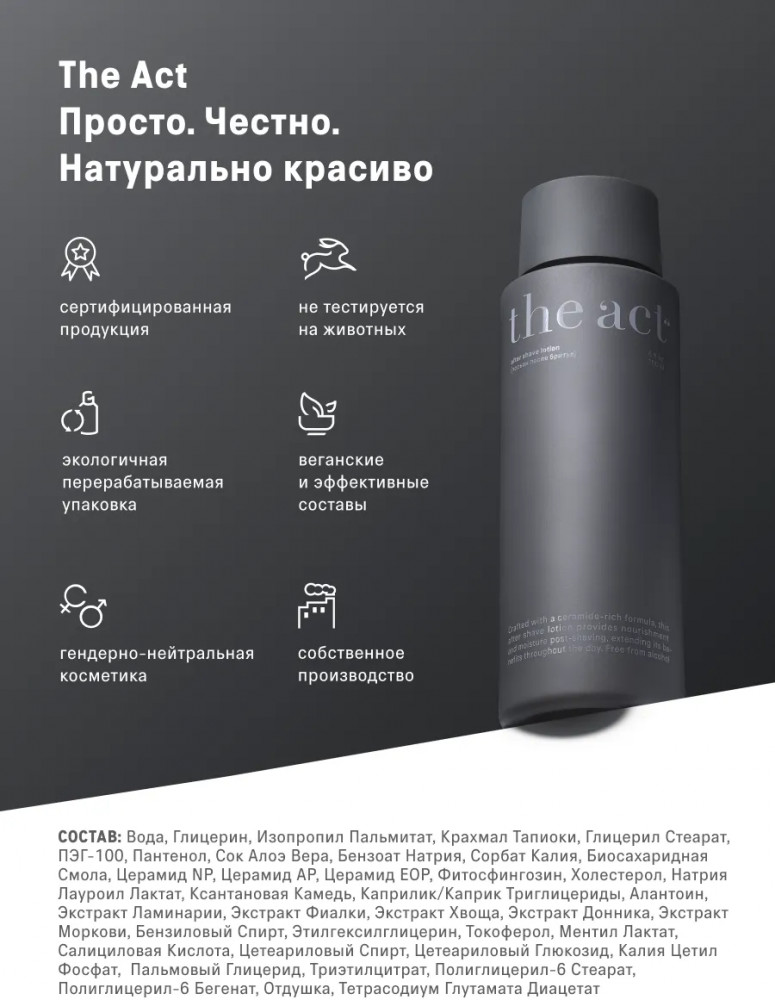 The Act Лосьон увлажняющий после бритья «After Shave Lotion»В данный момент этот товар отсутствует в продаже. Возможно, у нас найдется аналогичный или похожий товар здесь. Каждое утро начинается с ритуала. Бритва, чистое лицо, и... что дальше? Лосьон для лица с церамидами The Act Men завершает процесс: увлажняет, восстанавливает, успокаивает и защищает кожу. Мягкая формула быстро впитывается, не содержит спирта и подходит для чувствительной кожи. |