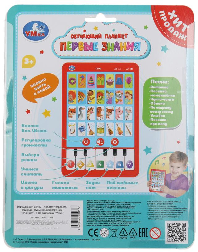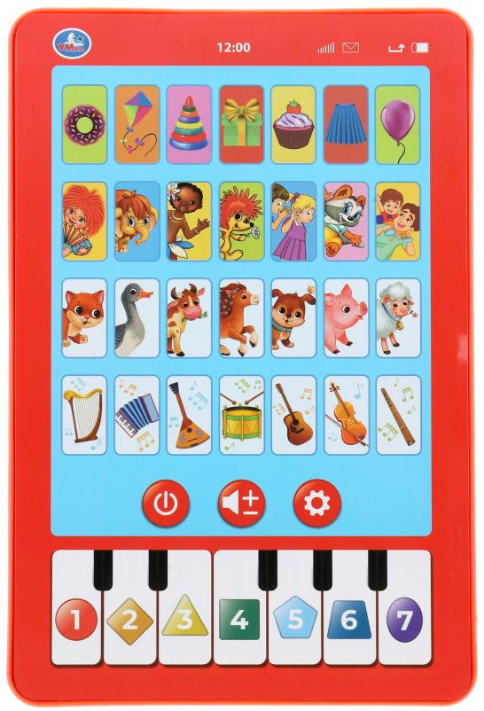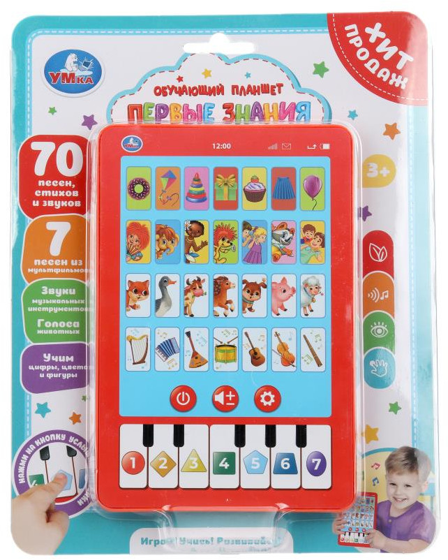 💳 Оплатить за товар можно при получении 🇰🇿 Есть бесплатная доставка по Казахстану от 1 дня 🎁 Копите бонусы с каждой покупки Обучающий планшет «Первые знания» ТМ «УМка» станет отличным подарком для маленьких любознаек. Игрушка-планшет — креативный и полезный подарок для развития и игры. Малыш с удовольствием будет нажимать на кнопки и слушать весёлые песни, а также знакомится с окружающим миром. В лёгкой игровой форме ребёнок научится считать, повторит названия цветов и геометрических фигур, узнает, как говорят животные. Кроме того, он сможет перейти в режим игры на пианино и наиграть по клавишам собственную мелодию. Благодаря компактному размеру игрушку удобно повсюду брать с собой. |