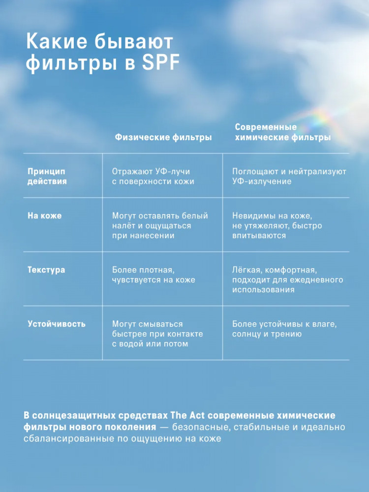 💳 Оплатить за товар можно при получении 🇰🇿 Есть бесплатная доставка по Казахстану от 1 дня 🎁 Копите бонусы с каждой покупки Ежедневное воздействие солнечных лучей может незаметно накапливать повреждения, приводя к сухости, потере упругости и появлению пигментных пятен. Защитить кожу от этих воздействий можно, используя солнцезащитный крем для лица The Act SPF 50. Крем обеспечивает защиту от UVA и UVB-лучей, предотвращает солнечные ожоги, поддерживает оптимальный уровень увлажнённости кожи даже под палящим солнцем, а также борется с фотостарением благодаря защитным и ухаживающим компонентам. Продукт эффективен не только летом, но и в условиях городского солнца или зимнего отдыха, что делает его универсальным средством для любого времени года. |