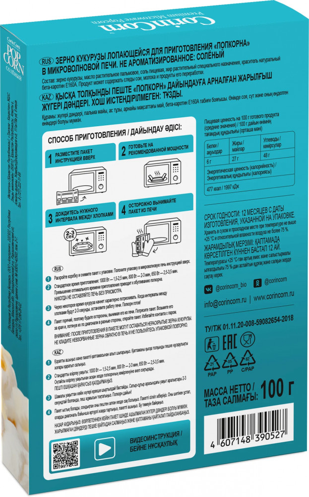 Зерно кукурузы, масло растительное пальмовое, соль пищевая, жир растительный специального назначения, краситель натуральный бета-каротин Е160А.
