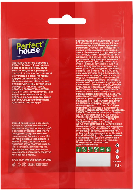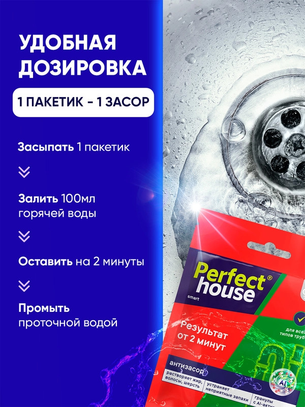 Perfect House Средство для чистки труб гранулированное «Антизасор»В данный момент этот товар отсутствует в продаже. Возможно, у нас найдется аналогичный или похожий товар здесь. Гранулированное средство мгновенно вступает в реакцию с водой и в течение 2 минут ликвидирует сильные засоры. Благодаря высокой концентрации основного действующего компонента и дополнительного Al-активатора гранулы способны быстро растворять засоры разнообразной природы — жир, волосы, шерсть, мыльные и известковые отложения, пищевые отходы. |
