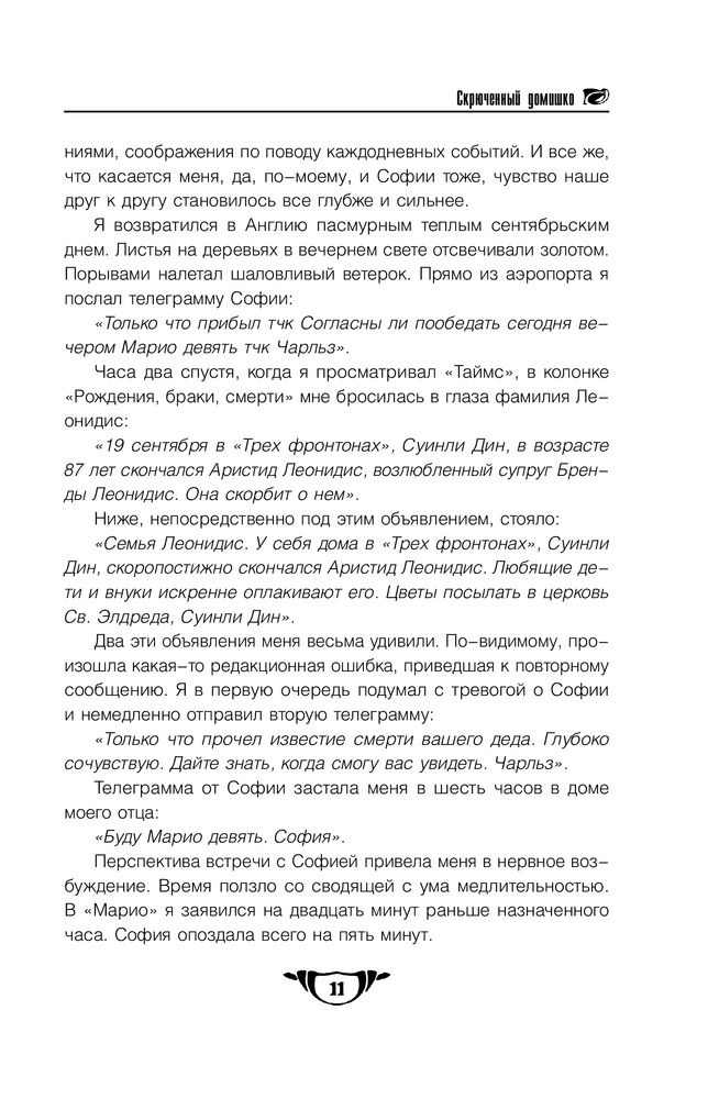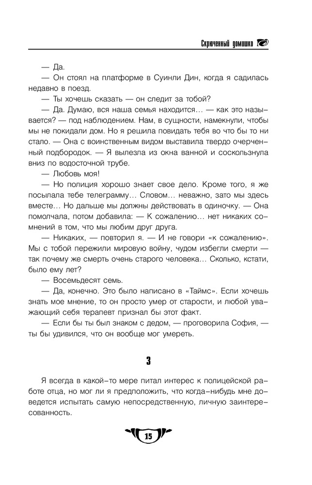 Помните английскую песенку в переводе Корнея Чуковского: "А за скрюченной рекой. В скрюченном домишке. Жили летом и зимой. Скрюченные мышки"? Для жителей особняка "Три фронтона" эта песенка весьма актуальна - разросшийся пристройками коттедж, населенный большой шумной семьей, действительно напоминает тот самый "скрюченный домишко". В таком доме просто обязана царить веселая кутерьма. Но однажды там стали совершаться убийства.