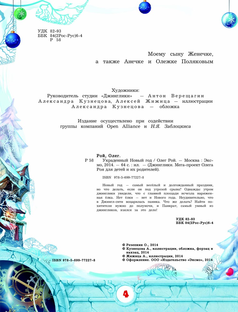 В данный момент этот товар отсутствует в продаже. Возможно, у нас найдется аналогичный или похожий товар здесь. Серия: Джинглики Новый год – самый весёлый и долгожданный праздник, но что делать, если он под угрозой срыва? Однажды утром джинглики увидели, что с главной площади исчезла наряженная ёлка. Нет ёлки – нет и Нового года. Не удивительно, что в Джингл-сити воцарилась паника. Что же делать? Найти похитителя нужно до полуночи, и Панкрат, самый умный из джингликов, взялся за это дело! |