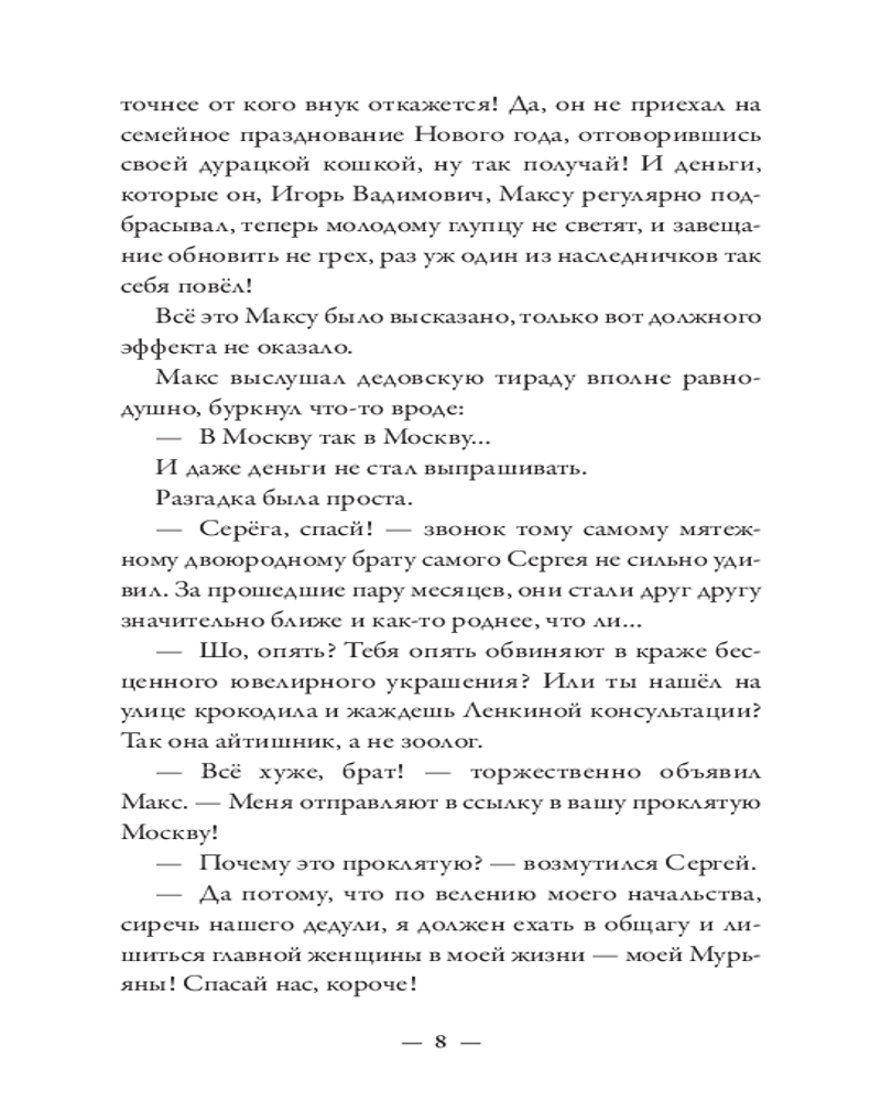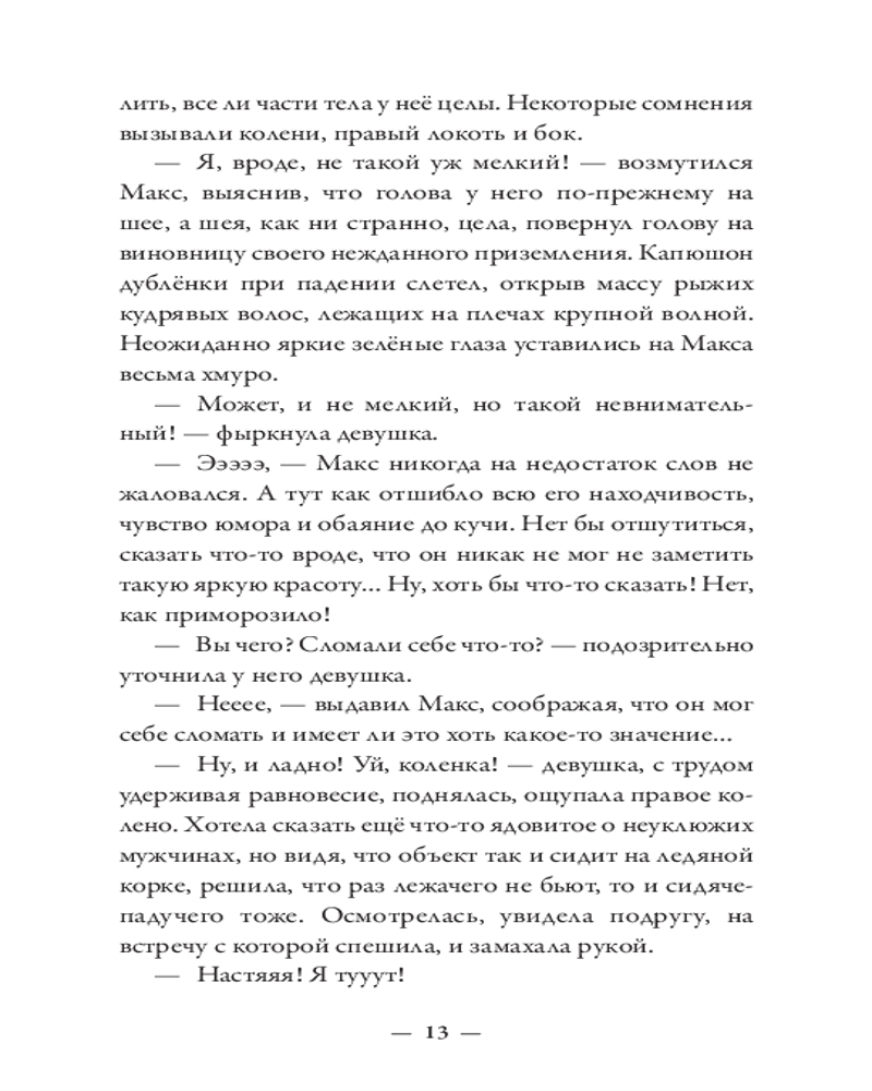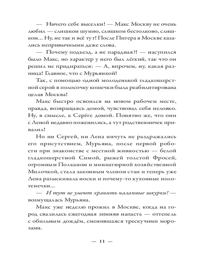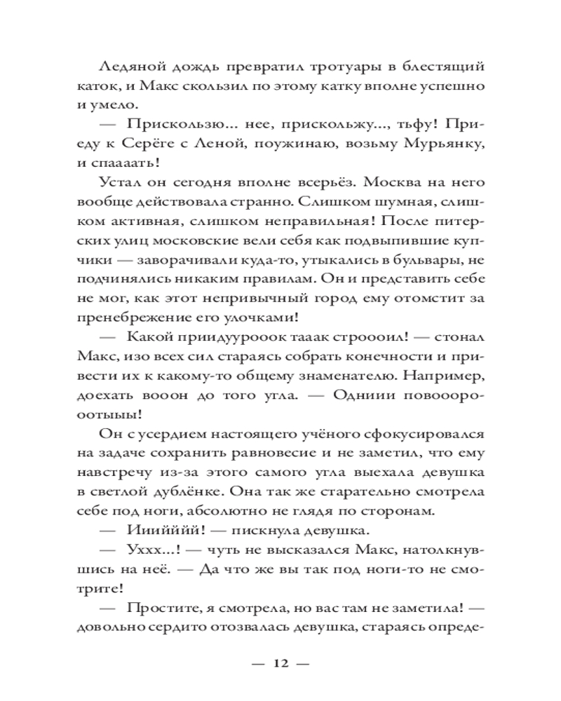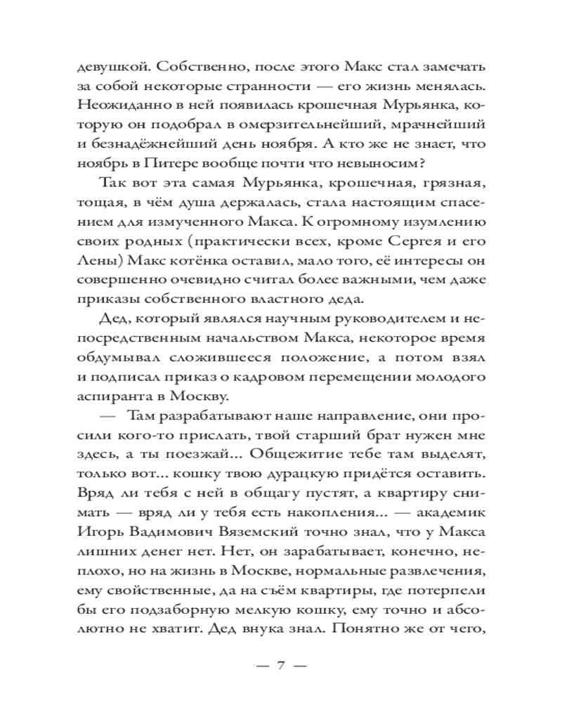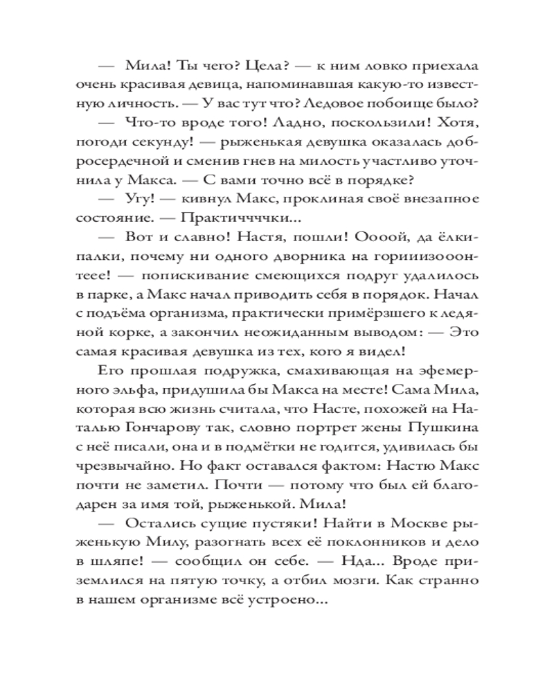 💳 Оплатить за товар можно при получении 🇰🇿 Есть бесплатная доставка по Казахстану от 1 дня 🎁 Копите бонусы с каждой покупки Серия: Абсолютно неправильные люди Макс — из тех, кто всё делает неправильно. Бросить престижную работу ради подобранного на улице котенка и быть сосланным из любимого Петербурга в чужую зимнюю Москву? Легко! Влюбиться с первого взгляда в рыжеволосую незнакомку в огромном незнакомом городе? Запросто! Искать ее, раз за разом натыкаясь на тупики? Вполне вероятно! Найти, полюбить еще сильнее и оказаться разделенными городами? С Максом всё возможно! Главное — понять себя: чего он хочет? Благополучную карьеру под крылом влиятельного деда или рыжеволосую Милу, забавную полосатую кошку Мурьяну и, самое главное, себя самого? Нева и Москва-река никогда не соединятся, но люди — не реки. Максу предстоит сделать выбор и решить, как ему жить, для чего и с кем. |