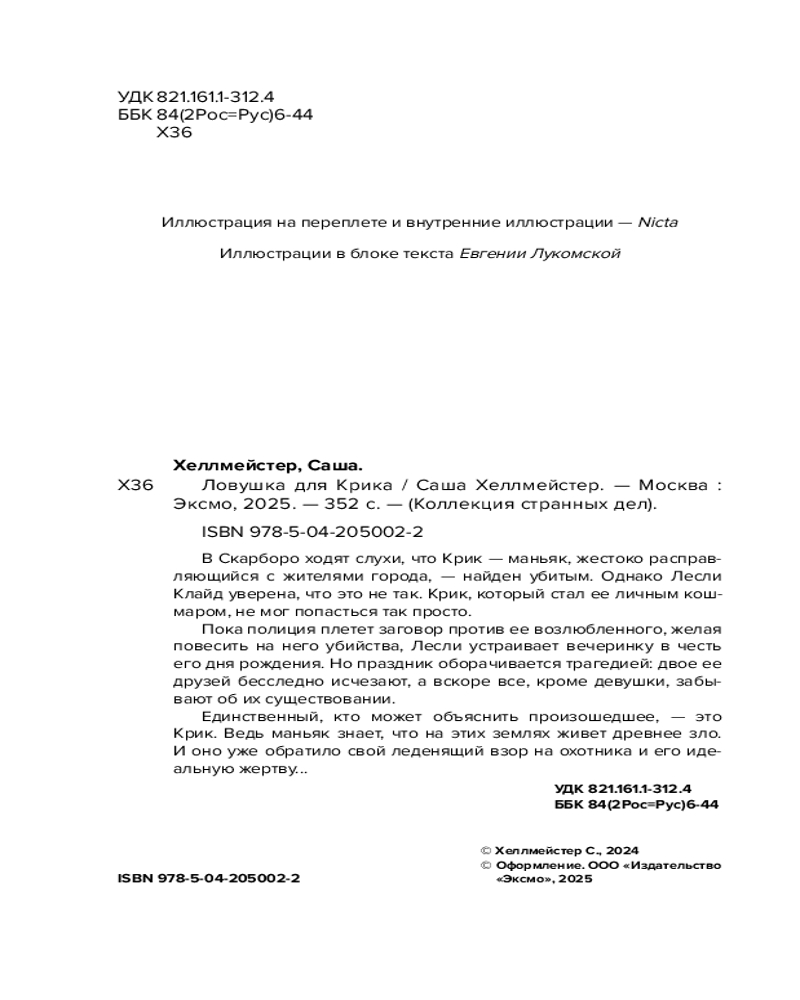 💳 Оплатить за товар можно при получении 🇰🇿 Есть бесплатная доставка по Казахстану от 1 дня 🎁 Копите бонусы с каждой покупки Серия: Коллекция странных дел В Скарборо ходят слухи, что Крик — маньяк, жестоко расправляющийся с жителями города — найден убитым. Однако Лесли Клайд уверена, что это не так. Крик, который стал ее личным кошмаром, не мог попасться так просто. Пока полиция плетет заговор против ее возлюбленного, желая повесить на него убийства, Лесли устраивает вечеринку в честь его дня рождения. Но праздник оборачивается трагедией: двое ее друзей бесследно исчезают, а вскоре все, кроме девушки, забывают об их существовании. Единственный, кто может объяснить произошедшее — это Крик. Ведь маньяк знает, что на этих землях живет древнее зло. И оно уже обратило свой леденящий взор на охотника и его идеальную жертву... |