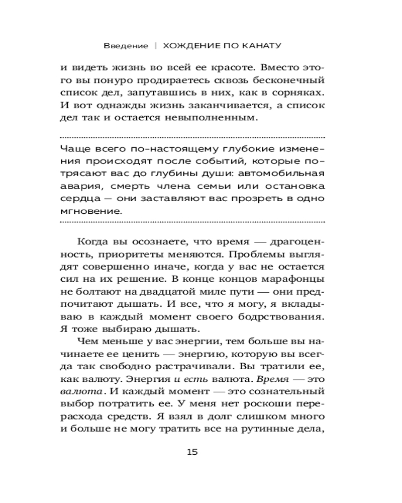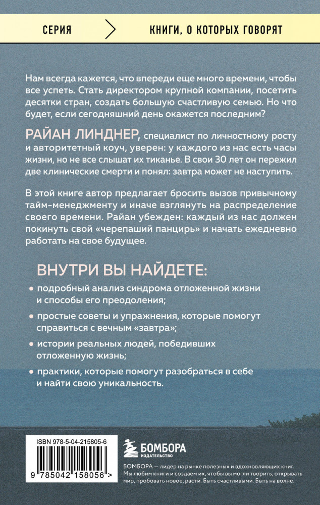 💳 Оплатить за товар можно при получении 🇰🇿 Есть бесплатная доставка по Казахстану от 1 дня 🎁 Копите бонусы с каждой покупки Серия: Книги, о которых говорят Нам всегда кажется, что впереди еще много времени, чтобы все успеть. Стать директором крупной компании, посетить десятки стран, создать большую счастливую семью. Но что будет, если сегодняшний день окажется последним? Райан Линднер, специалист по личностному росту и авторитетный коуч, уверен: «У каждого из нас есть часы жизни, но не все слышат их тиканье». В свои 30 лет он пережил две клинические смерти и понял — завтра может не наступить. В этой книге автор предлагает бросить вызов привычному тайм-менеджменту и иначе взглянуть на распределение своего времени. Райан убежден — каждый из нас должен покинуть свой «черепаший панцирь» и начать ежедневно работать на свое будущее. |