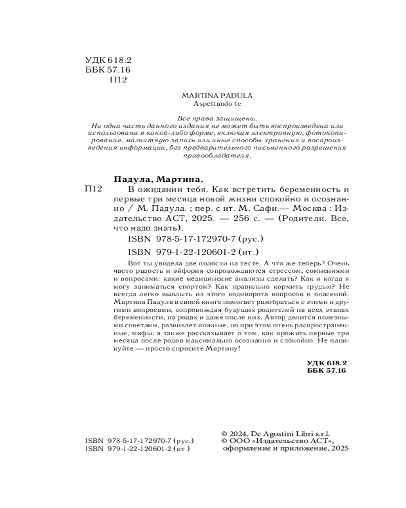 💳 Оплатить за товар можно при получении 🇰🇿 Есть бесплатная доставка по Казахстану от 1 дня 🎁 Копите бонусы с каждой покупки Серия: Родители. Все, что надо знать Вот ты увидела две полоски на тесте. А что же теперь? Очень часто радость и эйфория сопровождаются стрессом, сомнениями и вопросами: какие медицинские анализы сделать? Как и когда я могу заниматься спортом? Как правильно кормить грудью? Не всегда легко выплыть из этого водоворота вопросов и опасений. Мартина Падула в своей книге помогает разобраться с этими и другими вопросами, сопровождая будущих родителей на всех этапах беременности, на родах и даже после них. Автор делится полезными советами, развивает ложные, но при этом очень распространенные, мифы, а также рассказывает о том, как прожить первые три месяца после родов максимально осознанно и спокойно. Не паникуйте —— просто спросите Мартину! |