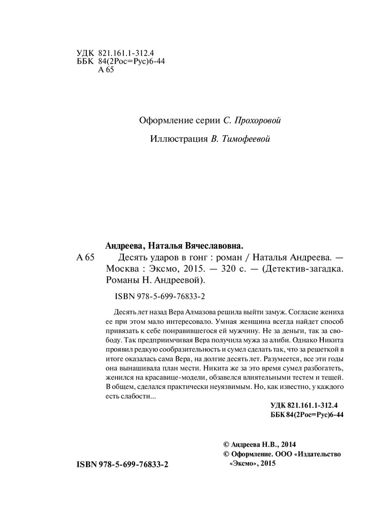 Десять ударов в гонгВ данный момент этот товар отсутствует в продаже. Возможно, у нас найдется аналогичный или похожий товар здесь. Серия: Детектив-загадка Десять лет назад Вера Алмазова решила выйти замуж. Согласие жениха ее при этом мало интересовало. Умная женщина всегда найдет способ привязать к себе понравившегося ей мужчину. Не за деньги, так за свободу. Так предприимчивая Вера получила мужа за алиби. Однако Никита проявил редкую сообразительность и сумел сделать так, что за решеткой в итоге оказалась сама Вера, на долгие десять лет. Разумеется, все эти годы она вынашивала план мести. Никита же за это время сумел разбогатеть, женился на красавице-модели, обзавелся влиятельными тестем и тещей. В общем, сделался практически неуязвимым. Но, как известно, у каждого есть слабости. |