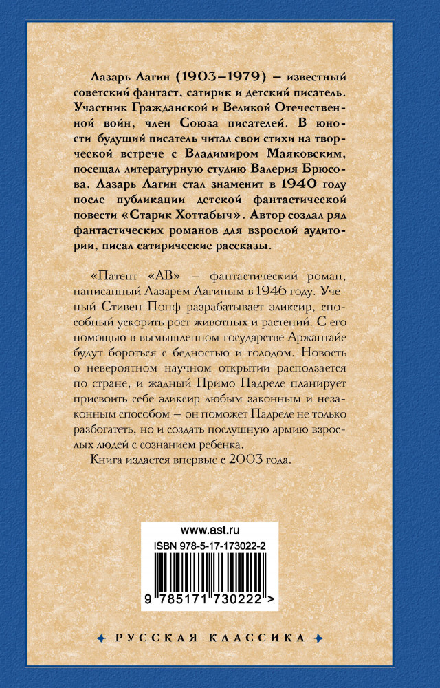💳 Оплатить за товар можно при получении 🇰🇿 Есть бесплатная доставка по Казахстану от 1 дня 🎁 Копите бонусы с каждой покупки Серия: Русская классика Патент «АВ» — фантастический роман, написанный Лазарем Лагиным в 1946 году. Учёный Стивен Попп разрабатывает эликсир, способный ускорить рост животных и растений. С его помощью в вымышленном государстве Аржантайе будут бороться с бедностью и голодом. Новость о невероятном научном открытии расползается по стране, и жадный Примо Падреле планирует присвоить себе эликсир любым законным и незаконным способом — он поможет Падреле не только разбогатеть, но и создать послушную армию взрослых людей с сознанием ребёнка. Для широкого круга читателей. |