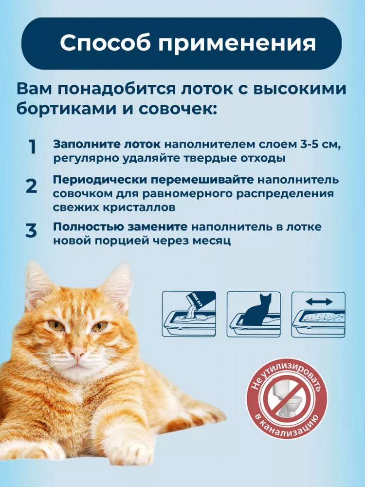 Способ применения: заполните сухой и чистый лоток наполнителем слоем 3-5 см. Регулярно удаляйте экскременты и перемешивайте наполнитель для равномерного распределения свежих кристаллов. Примерно через 4 недели удалите использованные гранулы и замените их новой порцией наполнителя. Не выбрасывайте использованный наполнитель в унитаз.
