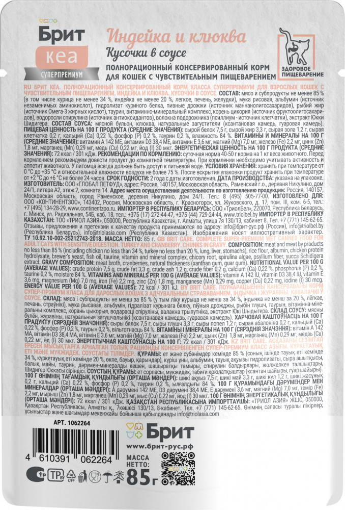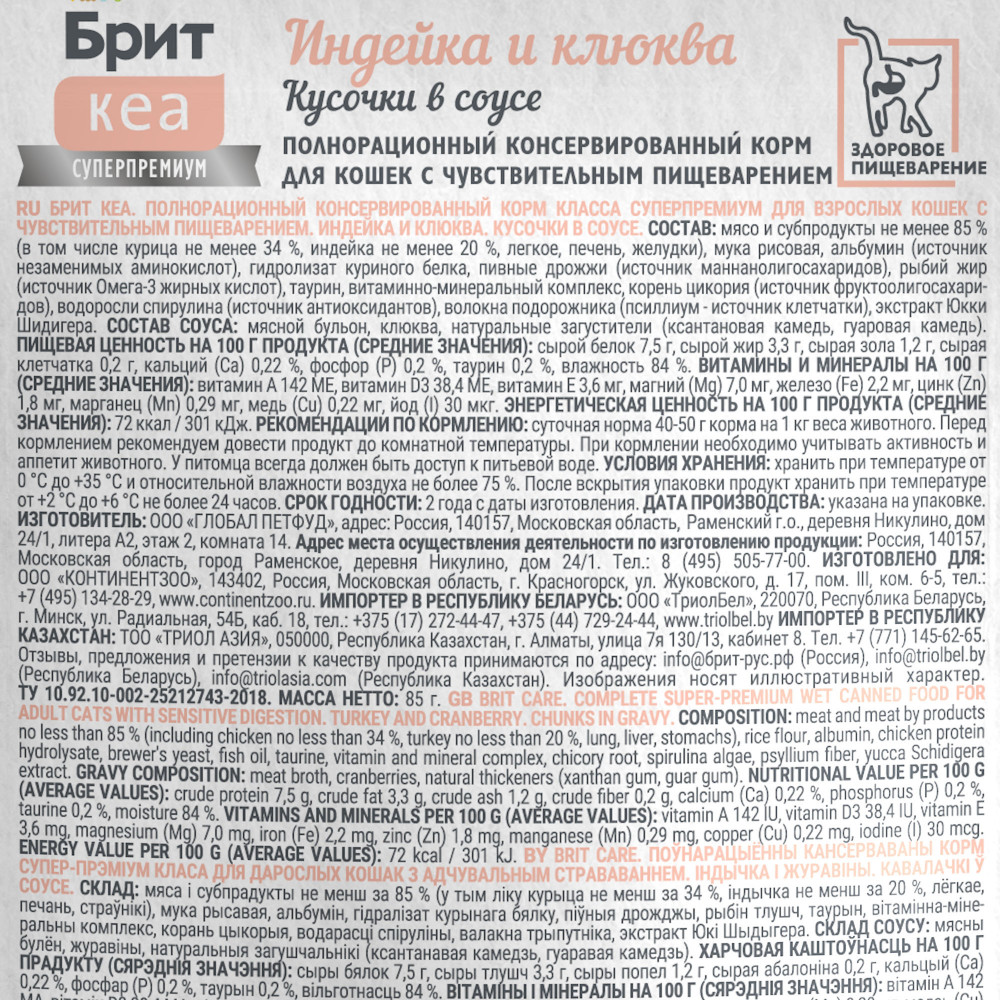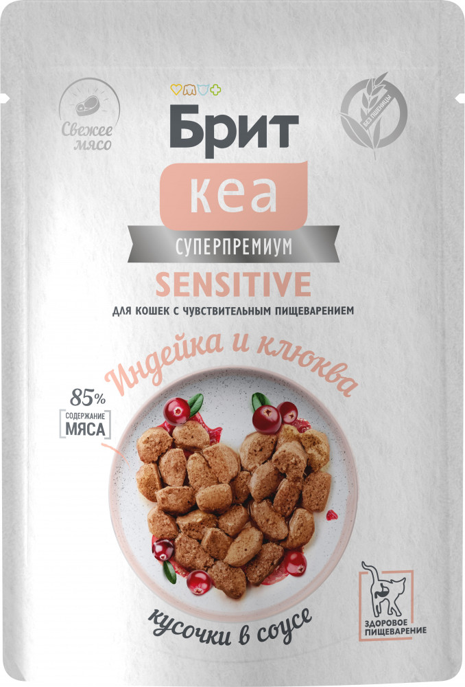 Brit Корм для взрослых кошек с чувствительным пищеварением с индейкой и клюквой, кусочки в соусе «Sensitive»
