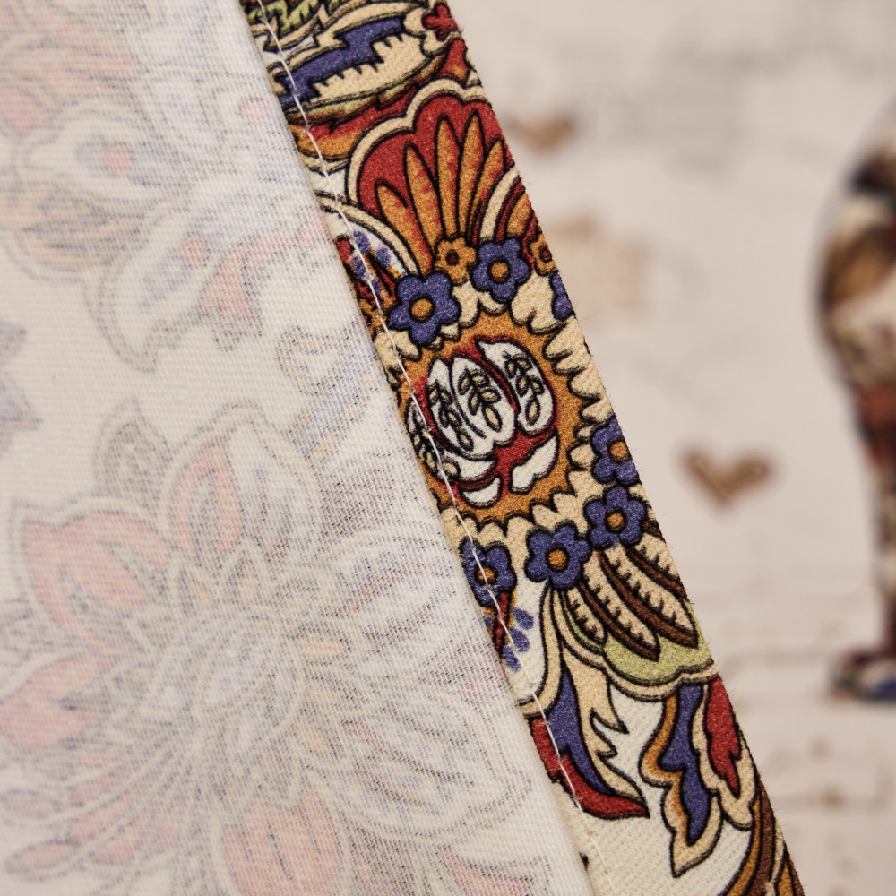 Цифровая печать позволяет перенести на изделия не только всё богатство красок и оттенков, но и придать особую прочность крашению, ткань не теряет своей яркости даже после 100 стирок. Изделия легки и не прихотливы в уходе, стирать нужно при температуре 40С, гладить при температуре от 110-170С с отпариванием, но нельзя подвергать хлорному отбеливанию. Для удобства эксплуатации на ряд изделий, такие как фартуки, скатерти, дорожки, может наноситься водогрязеотталкивающая пропитка которая не влияет на внешний вид изделия, но позволяет избежать сильного загрязнения при использовании.