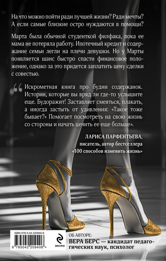 Серия: Записки московской содержанки На что можно пойти ради лучшей жизни? А ради мечты? Что, если самые близкие остро нуждаются в помощи? Марта — обычная студентка филфака, мысли которой заняты отличиями творчества Достоевского от других писателей и предстоящим зачетом по античной литературе. Но все меняется, когда ее мама теряет работу. Ипотечный кредит и содержание семьи ложатся на плечи девушки. Она была готова бросить учебу ради работы, но ее лучшая подруга Алиса посвящает Марту в мир модельного бизнеса, чтобы потом свести девушку с заинтересованным спонсором. Но что произойдет, когда золотая клетка захлопнется? |